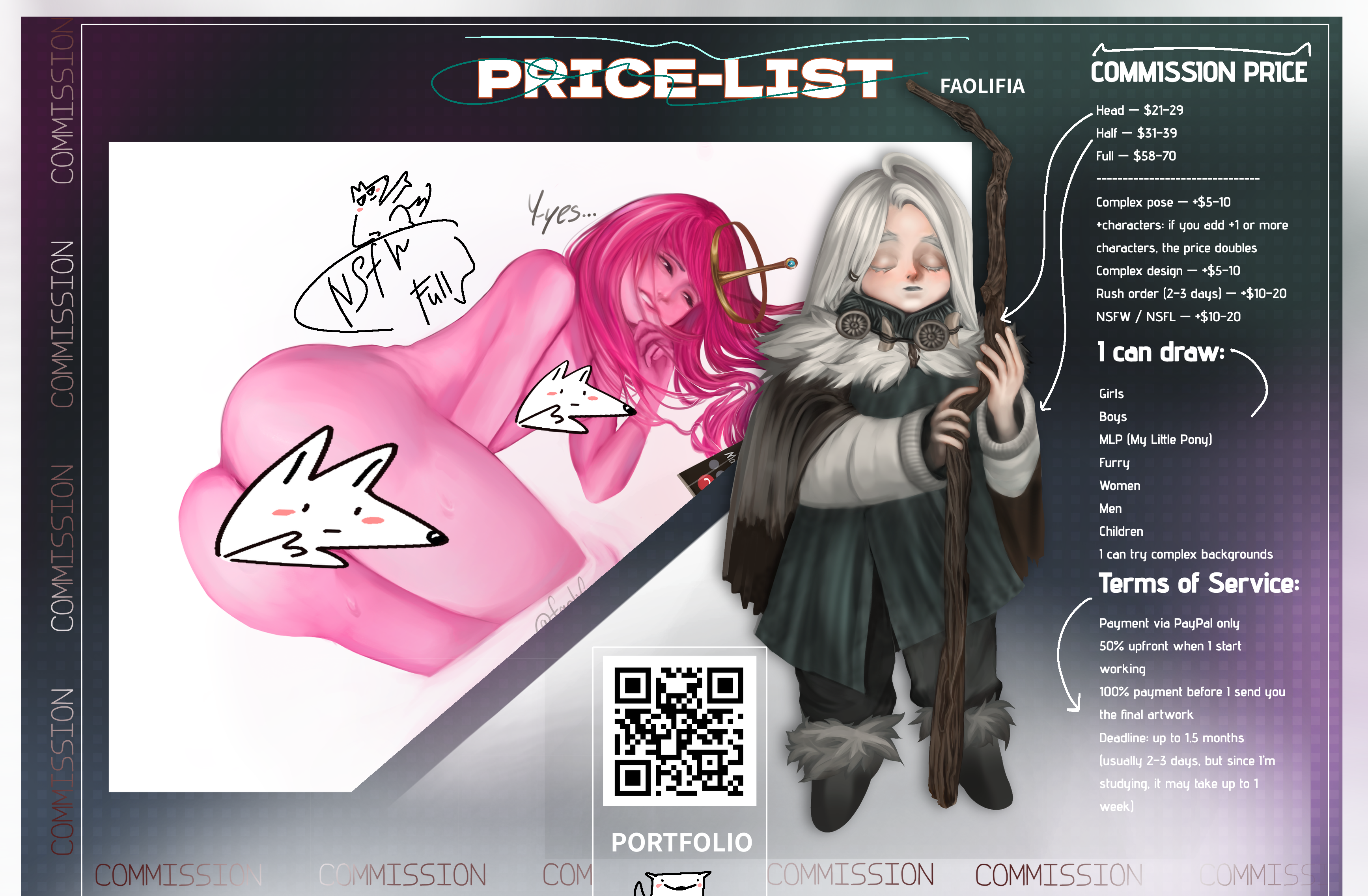 COMMISSION PRICE Head - $21-29 Half-$31-39 Full- $58-70 Complex pose - +$5-10 +choracters: if you add +1 or more characters, the price doubles Complex design - +$5-10 Rush order (2-3 days) - +$10-20 NSFW / NSFL - +$10-20 I can draw: Girls Boys MLP (My Little Pony) Furry Women Men Children I can try complex backgrounds Terms of Service: Payment via PayPal only 50% upfront when I start working 100% payment before 1 send you the final artwork Deadline: up to 1.5 months (usually 2-3 days, but since I'm studying. it may take up to 1 week