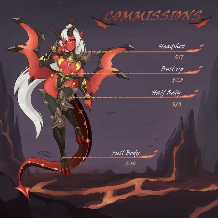 SB $17 MB $1 This is my complete price table (*´∀`*) Headshot $17 Bust $23 Half Body $30 Full Body $40 Extra Character +$20 Extra Objects +$8 NSFW +$20 ★ COMBOS ★ Full body + Nude version ( 2 drawing ) $70 *COMPLEX BACKGROUND WILL CHARGE A LITTLE MORE* Important Rules <(`^´)> .If you do not reply to my messages within 3 days, I will cancel your order .Payment will be made through PayPal .No fake bids