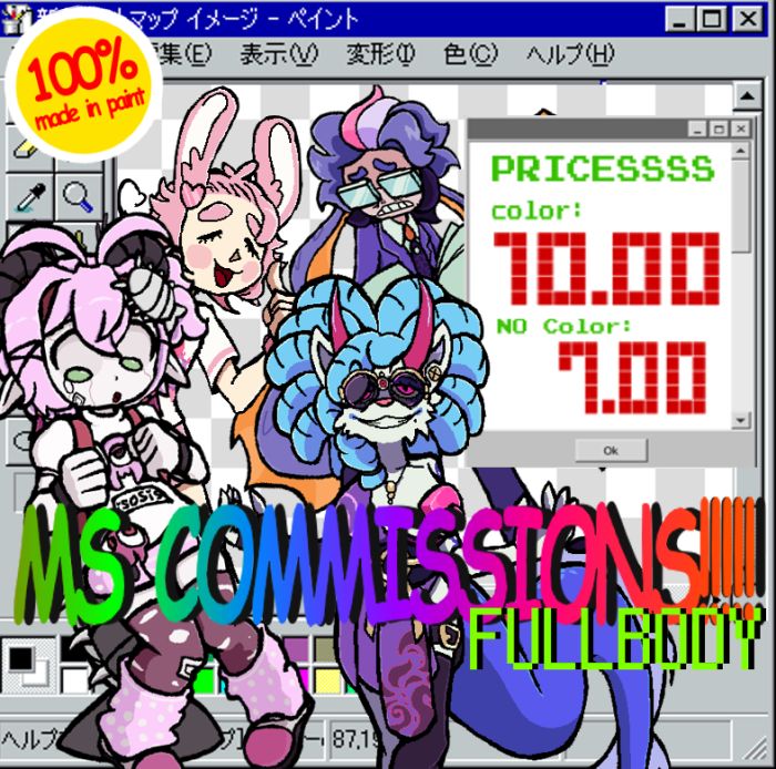 Sup?, I do paint stuff over here. 7$ per character. (+3$ if you want it with color) ✈ black and white mspaint version of your own character!!! (or any pre-existing character, idk, just ask.) ✈ I can do any kind of character. (Complex characters may be simplified to fit the art style, but don't worry—I'll do my best to preserve the original design.) ✈ The size will be around 350 X 700 px. (There might be slight variations depending on the character.) ✈ HEY, HEY, HEY! i need references of your character. I'm not a fortune teller, you know! ✈ When the drawing is finished, you'll receive a nice and unique PNG of your character. ✈ It'll take around 2 weeks to complete. (Probably less, but it depends on how much I have on my plate.) ✈ Payment through PayPal. Please, pay me through PayPal. I like PayPal money. ✈ if you win the auction, you'll have 48 hours to pay. ✂ I reserve the right to use the final drawing for my portfolio or as a sample. ✂ You get a MAXIMUM of two corrections. (It's paint; I don't have as many tools as other artists.) ✒ If you win, reach out within 48 hours or I'll, uh, not feel great. (if you don't dm me in the first 24h i'll send you a reminder ^^.) If you want a commission and don't have to wait, or in general if you want a more personal exchange, DM me here: DISCORD: brow7777777 GMAIL: [email protected] (Email will never die.)