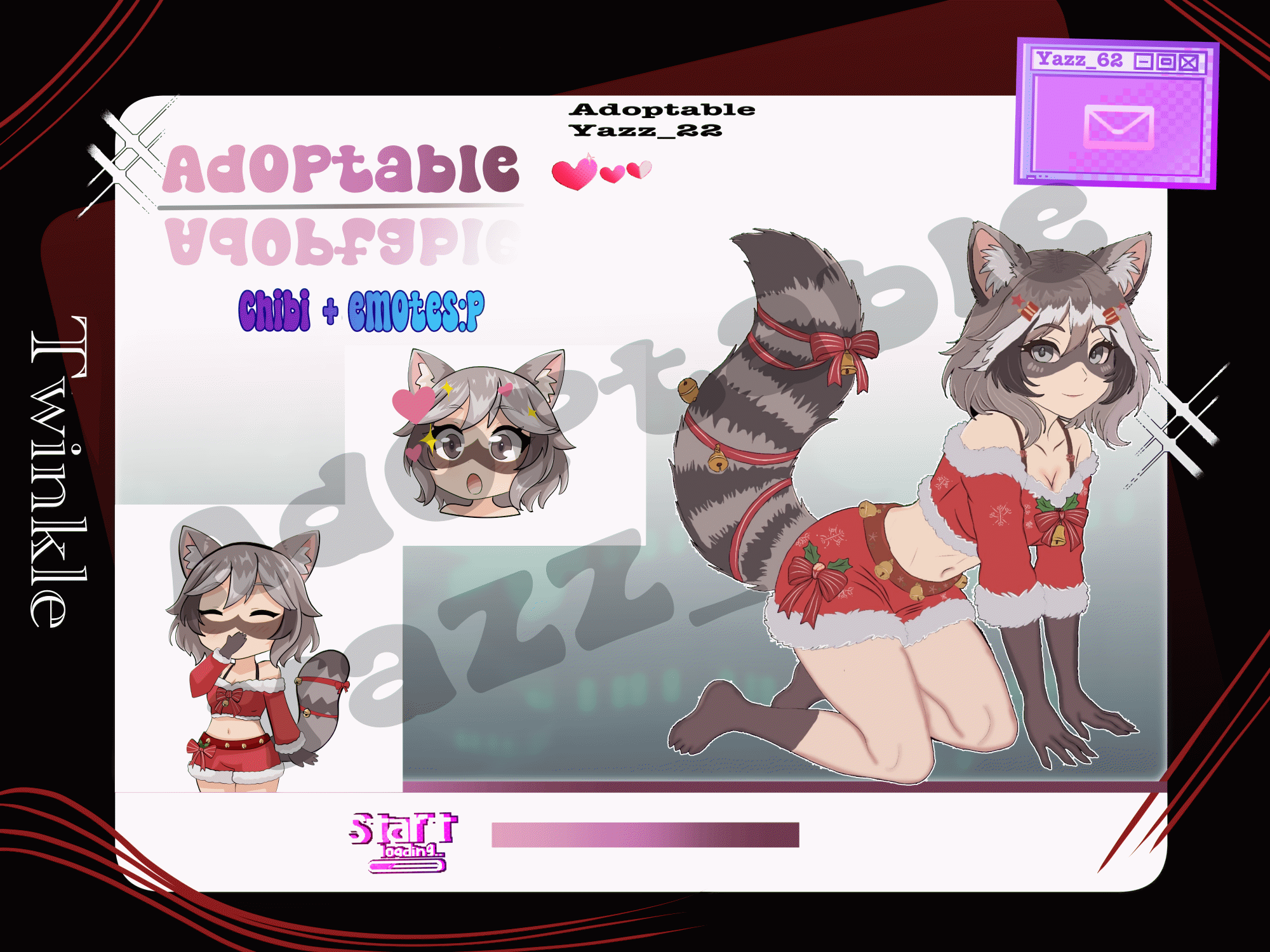 Adoptable ✨ Name: Twinkle Species: Raccoon Theme: Christmas / Winter Gender: Female Age (appearance): Young Personality: Twinkle is sweet, curious, and playful. She loves anything that sparkles or glows and is easily fascinated by festive lights. Despite her mischievous nature, she has a warm heart and enjoys spreading joy wherever she goes, especially during the winter season. Backstory: Twinkle was born in a snow-covered forest where magical Christmas lights appear every winter. Enchanted by their glow, she began collecting lost decorations to light the paths for wandering travelers. Legends say that if you see a soft twinkling light between the trees, Twinkle is nearby. Likes: Shiny lights ✨ Cookies and holiday sweets 🍪 Snowy nights ❄️ Gifts and decorations 🎁 Dislikes: Loud noises Darkness without lights Being alone for too long Extra Notes: Suitable for illustrations, stickers, emotes, and merch Can be adapted to different art styles Perfect for seasonal or festive collections 💰 ADOPTABLE INFORMATION 💰 SB: 5 USD Minimum Increment (MI): 1 USD AB: 50 USD You will receive: • PNG files • Editable PSD These are my partner’s very first adoptables! He has been a traditional artist for a long time, so he’s still learning and adjusting to digital tools. Thank you for your patience and understanding — he promises to keep improving with every new design. The chibi version was created by my boyfriend, who helped give it a cuter style that complements the main design. You can also view the animated chibi version here: https://drive.google.com/drive/folders/1V1MjtXj9ubdvyvHNS01YMU2u2UY6t3_i • Payment via PayPal only • Payment must be completed within 24 hours after winning the auction or claiming AB COMMERCIAL RIGHTS (AB ONLY) Can I use the character for portfolio purposes ✨ You can also view the animated stickers in the comments. ✨