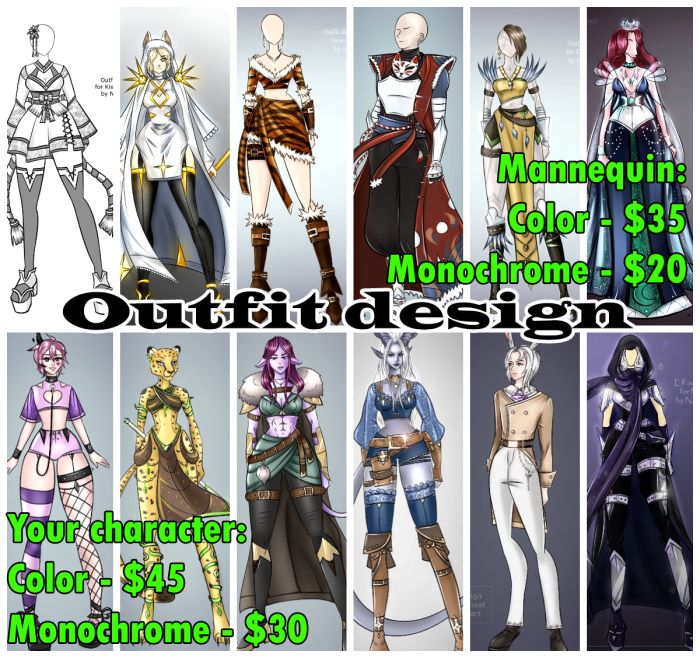 β I will draw NEW OUTFIT design for your character! (Any gender: female, male, femboy! any race!) πβπ¨ STYLE: Gothic, Cute (kawaii, Lolita fashion, anime etc.), FANTASY, Medieval, Tribal, Dark and evil, Warrior, erotic, sexy underwear. (It would be great if you tell me about your character!) π COLORED: - With your character $45 - Flat color $40 ( sample - https://www.furaffinity.net/view/60639619/ ) - Mannequin $35 (Simple background +$10) π NOT COLORED (sketch, only line): - With your character $30 - Mannequin $20 (Simple background +$5) π²Prepay on Hipolink https://hipolink.me/nagire_art or Boosty https://boosty.to/nagireart