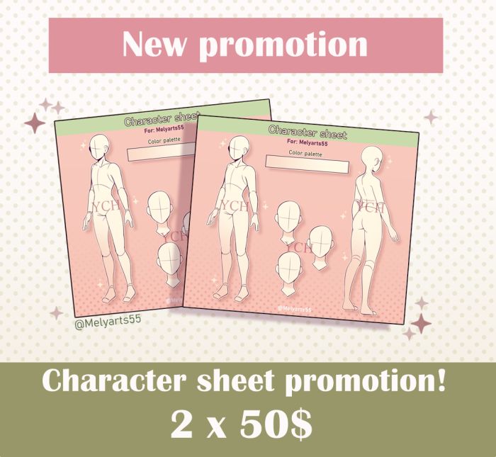 Character sheet promotion ✧ The promotion is 2 character sheets (full color) for $50! INFO • Paypal only. • The job would be in 5 or 10 weeks • Can be furries, aliens, humans, Closed Species, monsters, etc. • Expression can change.