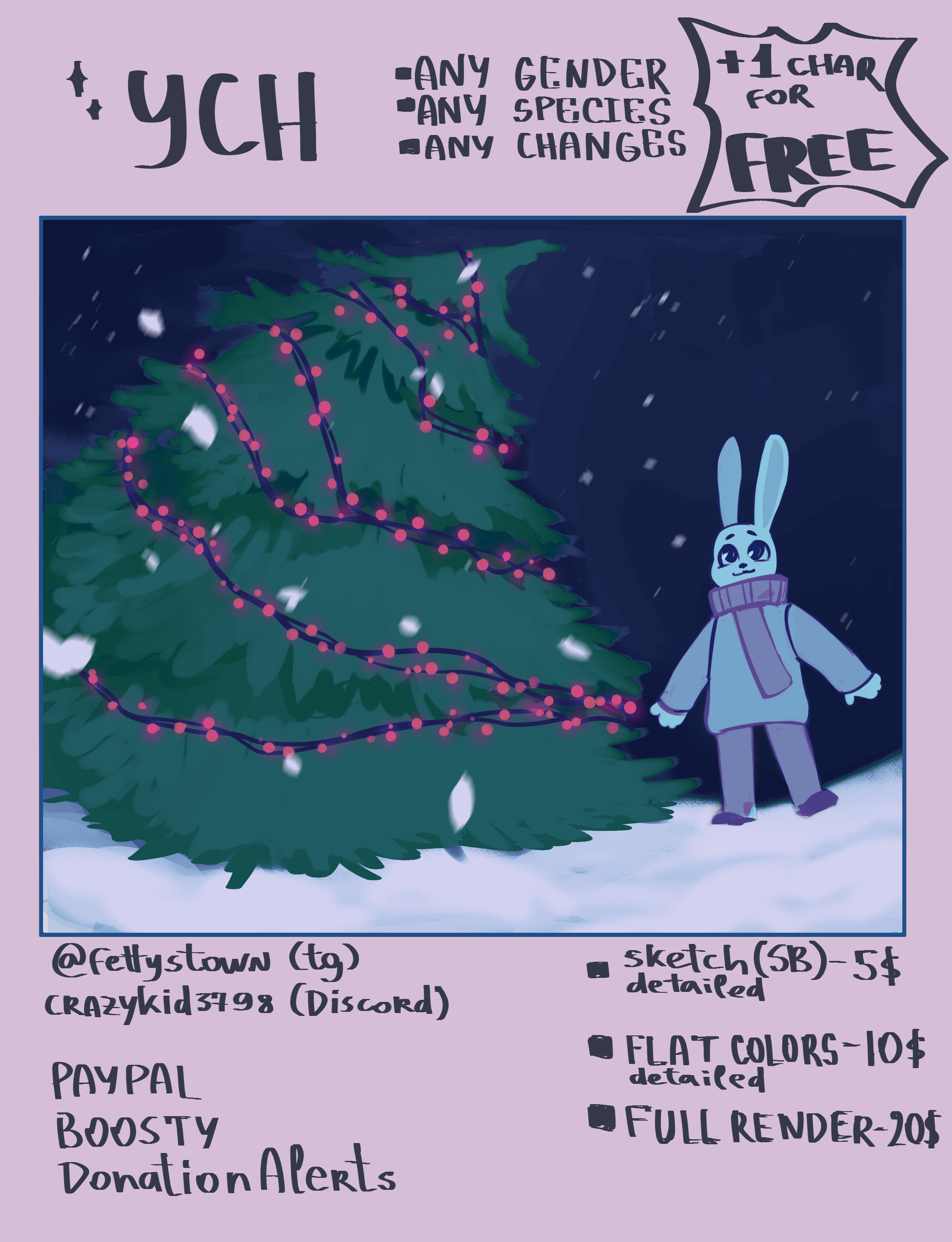 sb: $5 mi: $2 ab: $20 ~ ~ ~ ⚠️READ PLEASE⚠️ *Please make sure that payment on these platforms goes through! ~ ~ ~ 🐱 RULES: ❣️ PayPal: https://paypal.me/ZifaMustafina?country.x=IT&locale.x=it_IT ❣️ Boosty: https://boosty.to/fettystown ❣️ Donation Alerts: https://www.donationalerts.com/r/fetty_s_town ❣️ Any species ❣️ Any gender ❣️ Any changes ❣️ 100% prepayment ~ ~ ~ 📌 Price (detayled everywhere): LINE - 5$ LINE WITH FLAT COLOR - 10$ FULL-RENDER (detailed character) - 20$ ➕ Additional character (+1) for FREE! ~ ~ ~ You can contact me here 💬 Discord: crazykid3798 💬 Telegram: https://t.me/crzy_kid my portfolio: https://portfolio.commishes.com/user/FettysTown/ ~ ~ ~ ⌛️ Art work will be finished in 5-14days! ❓ Ask in comments