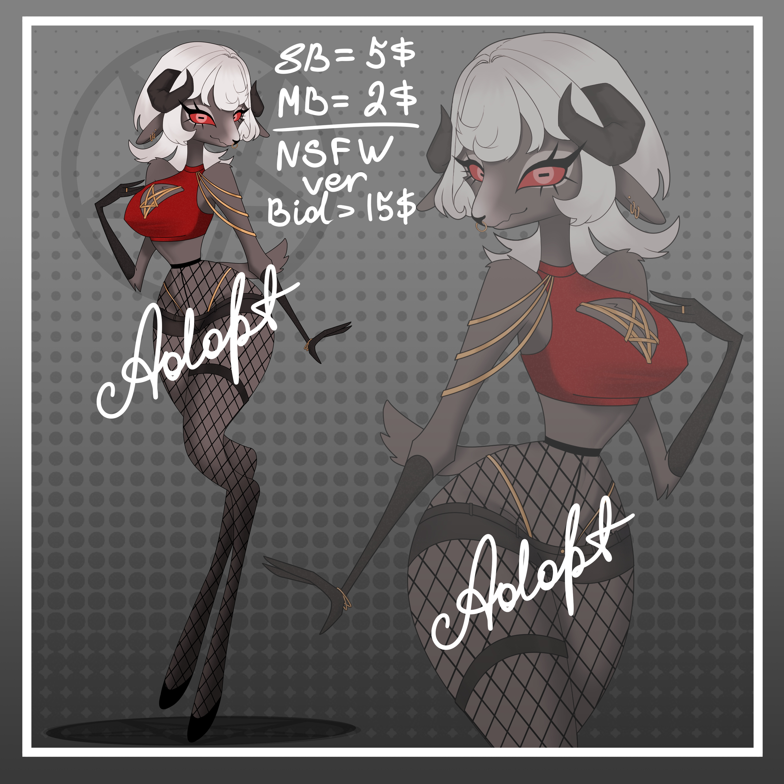 SB - $5 MB - $2 ✦ NSFW ver - bid is above $15 • The winner will have rights on this character and can do whatever you want with it. You can also change the design of the character. Feel free to create a name, backstory, and more for your character. • Resale is permitted, but the cost cannot be higher than you bought it. • The winner gets full-size picture with no watermarks +with transparent background. •Please contact me within 24 hours of the auction's end. Failure to do so will result in the cancellation of your purchase, and the adoptable will go to the second place or will be available again. payment: Hipolink Refunds and exchanges are not available.