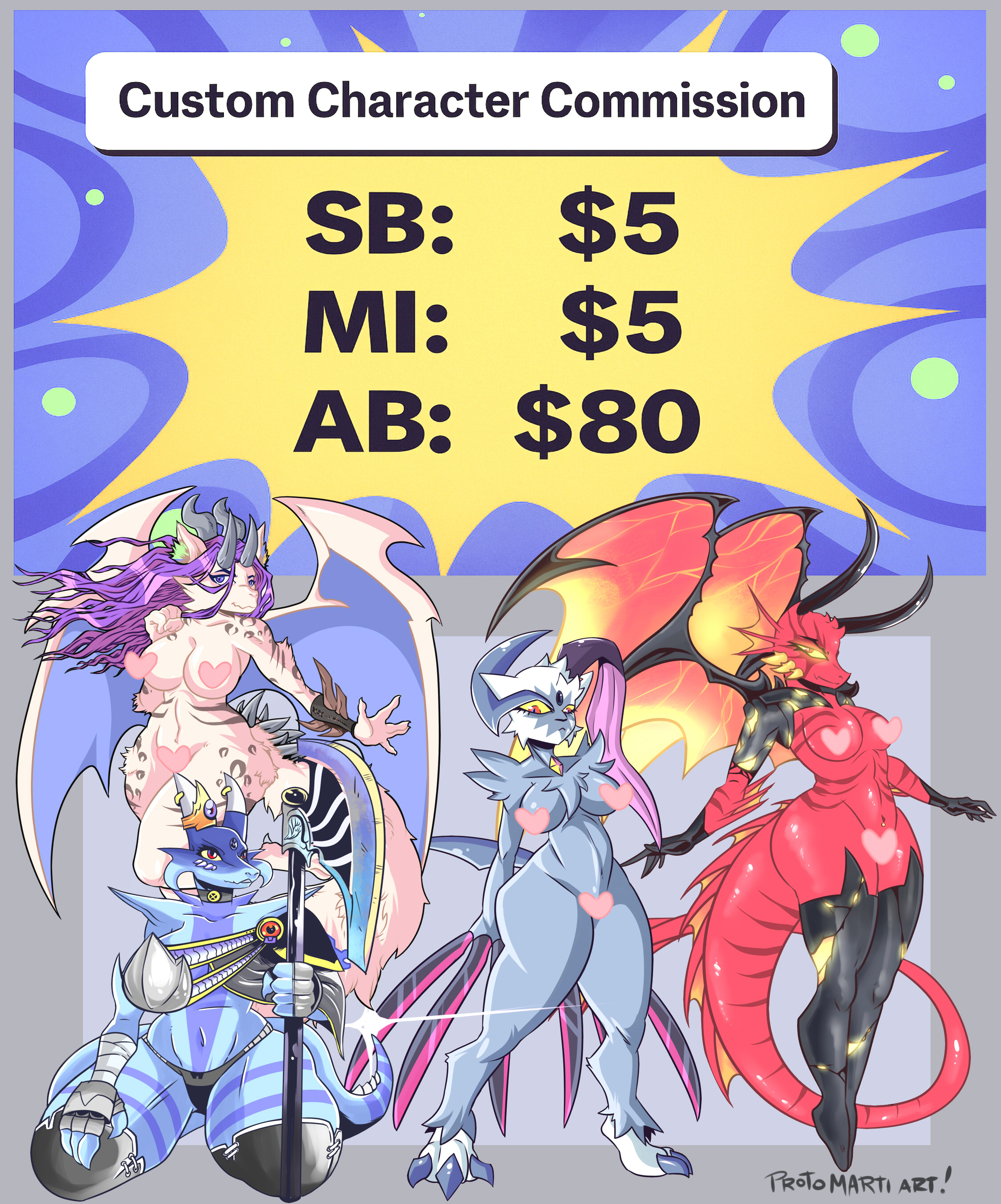 $5---SKETCH $15---LINEART $50--- FULLCOLOR - FULLBODY + basic background EXTRA OPTIONS (optional): (PENETRATION VERSION) +$25 (BLOWJOB VERSION ) + 20 the outfit (clothes) +WEAPONS OR MORE you want: +25 (sex whit other dragon or character) : + $60 the background you want : +30 PORTFOLIO! here you can see the quality of my work: https://portfolio.commishes.com/user/protomarti/ LOOT AND REVIEWS! here you can see my good reviews from other clients :3 : loot.commishes....rotomarti/ AUCTIONS RULES -Payment via PayPal only, within 24 hours. -No refunds.(you can check out my portfolio to see examples of my style and quality -Each drawing takes between 1 and 2 weeks