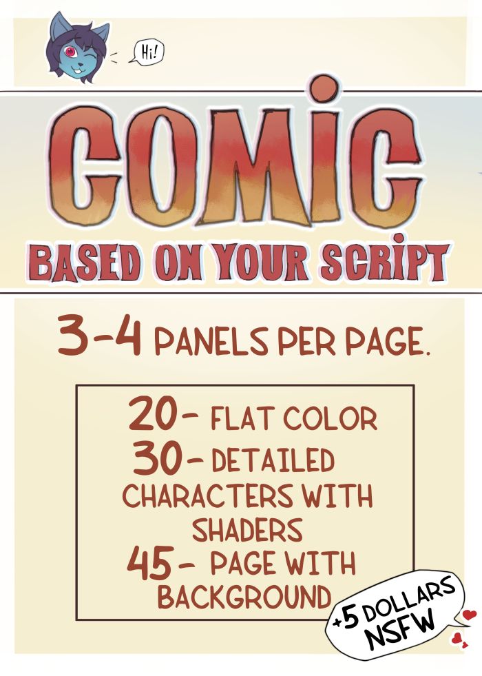 Hi :) If you want to bring your character to life using comics, then I will be happy to help you with this. 3-4 actions per page. Page proportions 4x5.2 The number of actions per page depends on your plot. Some moments are better drawn using three actions. Any story :) Any race, any gender (SFW,NSFW) $20 - flat colors $30 - detailed characters with shades $45 - page with background +5$ - NSFW Any details can be discussed) Boosty Hipolink
