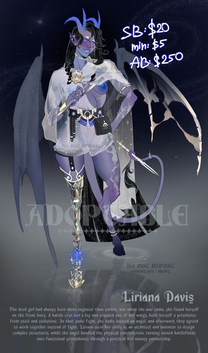 SB: $20 : image like example without watermark AB: $250 : fullart (SFW/NSFW) OR ref sheet (back view, portrait) If you want to add another outfit, weapons, stuff ask me (+10-40$) ‼️PLEASE READ DESCRIPTION‼️ -NO delays -Payment via PayPal (Friend and Family) within 48 h -I can use image with watermark for my portfolio and socials -If payment was not made the auction be restarted