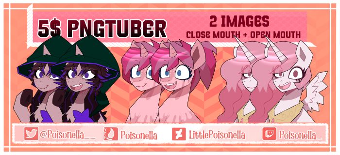 ╭─────────────· · · ✦ │ ʚ🌙ɞ 𝐇𝐞𝐲𝐲! ╰─────────────· · · ✦ ⭑ I’m in the tough position of offering custom pngtubers on this cartoony style for 𝟓𝐔𝐒𝐃 instead of 𝟏𝟎𝐔𝐒𝐃 I’m currently in a vulnerable moment . ✦SB✦ ♦ $ 5 USD ✦MB✦ ♦ 1$ USD AUTOBUYS SYSTEM ✦1th AB✦ ♦$ 10 USD +2 Blink images ✦2nd AB✦ ♦$ 15 USD +2 Blink images + 1 Hand Up ✦3rd AB✦ ♦$ 20 USD +2 Blink images + 2 Hands Up Diferent Emotion 10$+ I accept PayPal only. TOS ✤ Don't repost, copy, edit, sell or use without my permission. ✤ Total payment before start ✤ I'm allowed to post the commision results on social media but can tell me if you don't want that. ✤Wait time depends on the complexity of the commission. Typically are completed between 2 days to 2 weeks depending the amounth. ✤I do not refunds. █ ▇ Thank you so much for your interest, I look forward to working with you! ▇ █ It will be delivered on Drive Folder with the following format and sizes 2 Images 1000px x 1100px ↳ 𖥔 𝐀𝐧𝐲 𝐬𝐩𝐞𝐜𝐢𝐞𝐬 𝐢𝐬 𝐯𝐚𝐥𝐢𝐝 ───────────────✧ ♡ Thank you for reading ♡ ───────────────✧ -------------- __ Please, read this You can order directly here https://crm.commishes.com/task/create/Poisonella/ The link to pay is given once you open the commission Other Sites https://www.deviantart.com/littlepoisonella https://twitter.com/Poisonella__ ❤ my 15k precious https://www.youtube.com/@Poisonella Doubts and questions: Discord: Poisonella Me testimonial https://loot.commishes.com/testimonial/on/Poisonella/ My Portfolio https://portfolio.commishes.com/user/Poisonella/