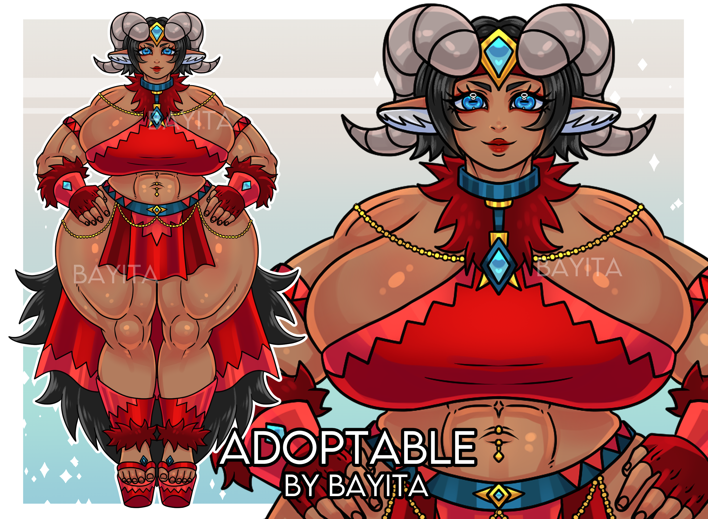 Adopt - Warrior Goat - Sb: $30usd Mi: $5usd AB: $120usd (Commercial use) (Auction will close 24 hours) --Base and art by me-- --Rules-- - Serious offers only, please. - Payment must be made within 24 hours after the auction ends, otherwise it will be auctioned again. - No refund. - Payment through Paypal. - You can make small modifications. --You will receive-- - The full image of the demo without watermarks. - Version in png format without background. --You can follow my work and upcoming adoptables at-- - twitter.com/BL_Baya