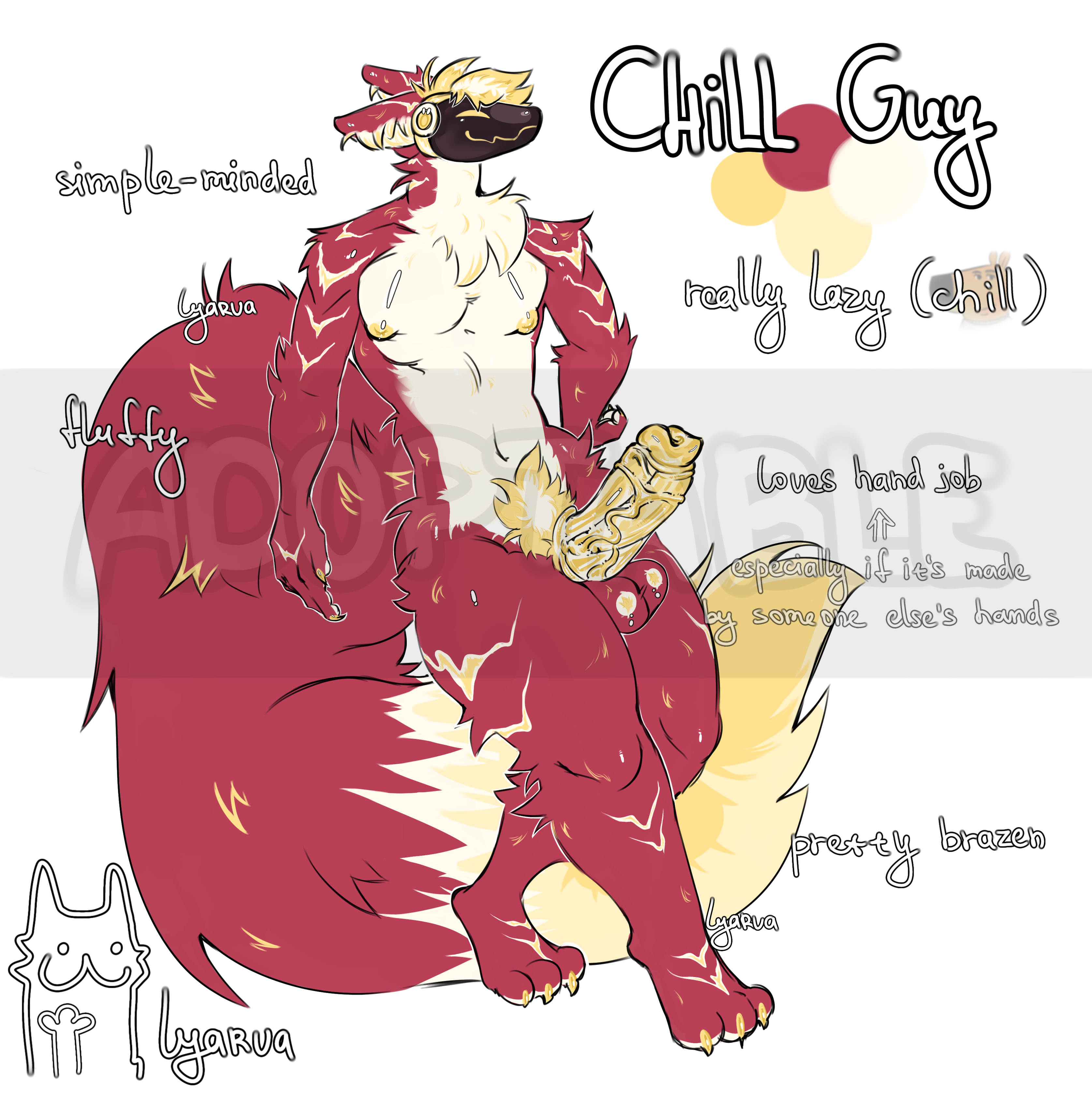 A pretty simple guy who actually doesn't mind spending the evening watching TV with popcorn. Or just play novels to forget about what is happening in the world and your life. He is not a fan of exertion and does not easily acquire motivation, because it is more likely for him to simply jerk off at the end of the evening, exhale and fall asleep right on the couch. Oh, he's really lazy and self-sufficient. Even impudent, partially. And he may really be likable to others, but he's, you know, a "lazy genius" who doesn't achieve anything. And they just don't know about the size and thickness of his penis. But nevertheless, he is a very good friend, with whom you can safely have a couple of glasses of beer at the bar. [you can completely change the information about it upon purchase] ✦SB : 15 $ ✦Min : 1 $ ✦AB : 100 $ - mastering all the privileges ✦ make a version with any genitals to suit your taste > 40 $ ✦ render and shadows > 60 $ ✦ design changes > 80 $ ✦ ab - 100 $ other: ✦payment Hipolink (via PayPal) and PayPal ✦you will receive the image as a file by mail or telegram without labels, but with my nickname as the artist ✦you also get images on a transparent background ✦payment is made within 48 hours, and then the auction will be restarted (but if you need a delay, we can negotiate) ✦no refunds ✦to indicate as an artist - there are no other rules ✦reviews: https://loot.commishes.com/testimonial/on/lyarva/ ✦where else can you see the content from me:✦ https://ych.commishes.com/user/lyarva/ https://ych.art/user/lyarva https://www.deviantart.com/lyarva0 https://t.me/sosic02 https://boosty.to/assgard https://www.furaffinity.net/user/lyarva/ 💐good luck to you💐