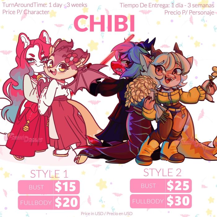 🍓CHIBI STYLE 1 (flatcolor) Bust: 15 usd Fullbody: 20 usd 🍓CHIBI STYLE 2 (fullcolor) Bust: 25 usd Fullbody: 30 usd price is p/character 🍓Payment Paypal, Wise, via Vgen ( https://vgen.co/faninidraws ) or Mexican Bank Transfer 🍓✔ I Draw ✔ Human | Furry | Feral | Pony | D&D | OC’s | Fanart | Real People | Couples 🍓Delivery Time 1 week - 4 weeks maximum