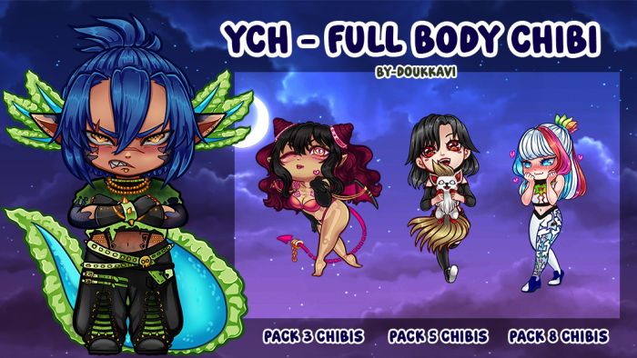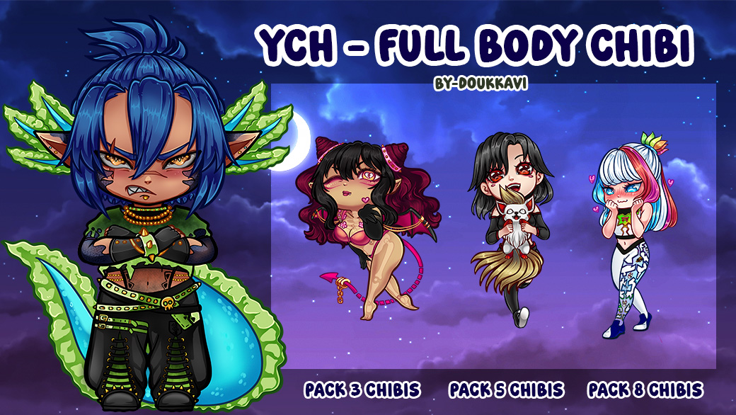 Packs CHIBI Stickers ᯓ★ YCH CHIBI COMMISSIONS ᯓ★ ¡Hi! I’m DoukkaVI, I design your character as an CHIBI. Tell me your ideas and I’ll work on them quickly ⸜(。˃ ᵕ ˂ )⸝♡ 1 Chibi FULL BODY $10 USD _Pack 3 Chibis FULL BODY $25 USD _Pack 5 Chibis FULL BODY $45 USD _Pack 8 Chibis FULL BODY $60 USD I DO: _Furry _Human _SFW/NSFW It is possible to draw different characters within the order number I DELIVER: 𖦹The requested emotes in PNG format with all sizes needed. 𖦹File sizes 1000x1000 px [ Payment only trough PayPal ]