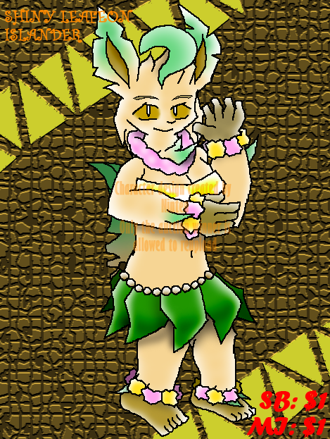 A shiny Leafeon from the tropics. Wouldn't it be nice to have a bit of island flair in your life? Bidding Prices Starting Bid: $1 Minimum increment: $1 Bidding Bonuses Back reference: $10 Half body line art: $30 Full body, fully colored art: $40 Bidding Rules The winner will receive the character and a copy of the reference image without the watermark, alongside the listed bonuses if their bid meets or exceeds the goal given. Once your payment has been processed, you're free to do whatever you want with the character. You can even make some adjustments to the design. I can communicate either through CRM or on Discord. Payment must be made within 24 hours. If the second and third bidding bonuses have been met, then the payment must still be made after the artwork has been completed to the bid winner's liking. I do not accept refunds.