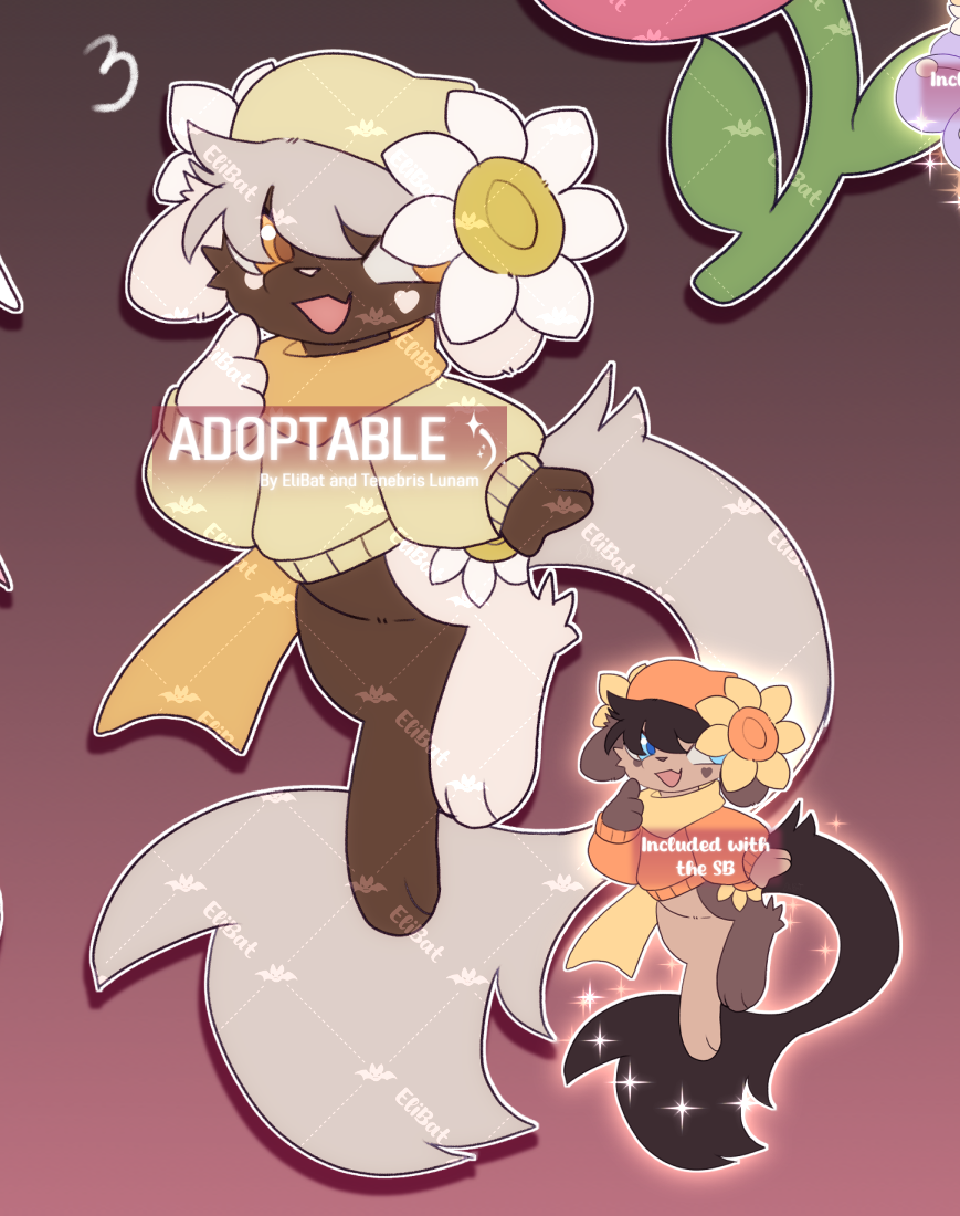 Hiii everyone~ New babies available! Collab between EliBat and Tenebris Lunam Make sure you read the rules!~ Remember to join our discord server to be tagged when we upload more beans, as well as exclusive auctions! discord.gg/Xy6X9QUPwU Remember to check the shinies ! And by being a Ko-fi support (of any level) you get the chance of pre-claim for a little less! *Shiny is included with the pucharse BUT having new files turned shiny will cost an adittion of $5 (addition to the total price) *TENEBRIS LUNAM AND ELIBAT'S BIDS ARE FROM OTHER SITES - DA/FA: Bid in chain/respond to previous bidder of same bean. 1. Humanoid Roselia 2. Lycoris Kirlia 3. Mew x Smeargle Sunflower 4. Pichu x Flabebe 5. Lurantis x Shaymin Each: SB: $25 MIN: $2 AB : $75 - You'll obtain 2 Extra fullbodies of the character (Either of those can be changed to the other stages if they have any, such as evolution or pre evolutions) AB2: $190 (Previous rewards) + Bust + Extra fullbody + 2 headshots + free color changes or small changes + Shiny + Icon or Chibi AB3* $250: (Previous Rewards)+ Human/Anthro/Feral Character Sheet. Sheet is of back and front view with some accessories or close ups. *AB2 AND AB3 DOES NOT OVERRIDE AB! THEY ARE ALTERNATE OPTIONS. <—— ANOTHER INFORMATION ——> Crossposted in Deviantart, Furaffinity and YCH links: Deviantart: https://www.deviantart.com/tenebrislunam/art/1302767413 Furaffinity: https://www.furaffinity.net/view/64122128 Facebook: RULES/TOS: https://tenebrislunam.carrd.co/#about Pokemon is owned by the Pokemon Company, Nintendo and GameFreak. We are not associated with them in any way. We own these designs. Art by EliBat and Tenebris Lunam