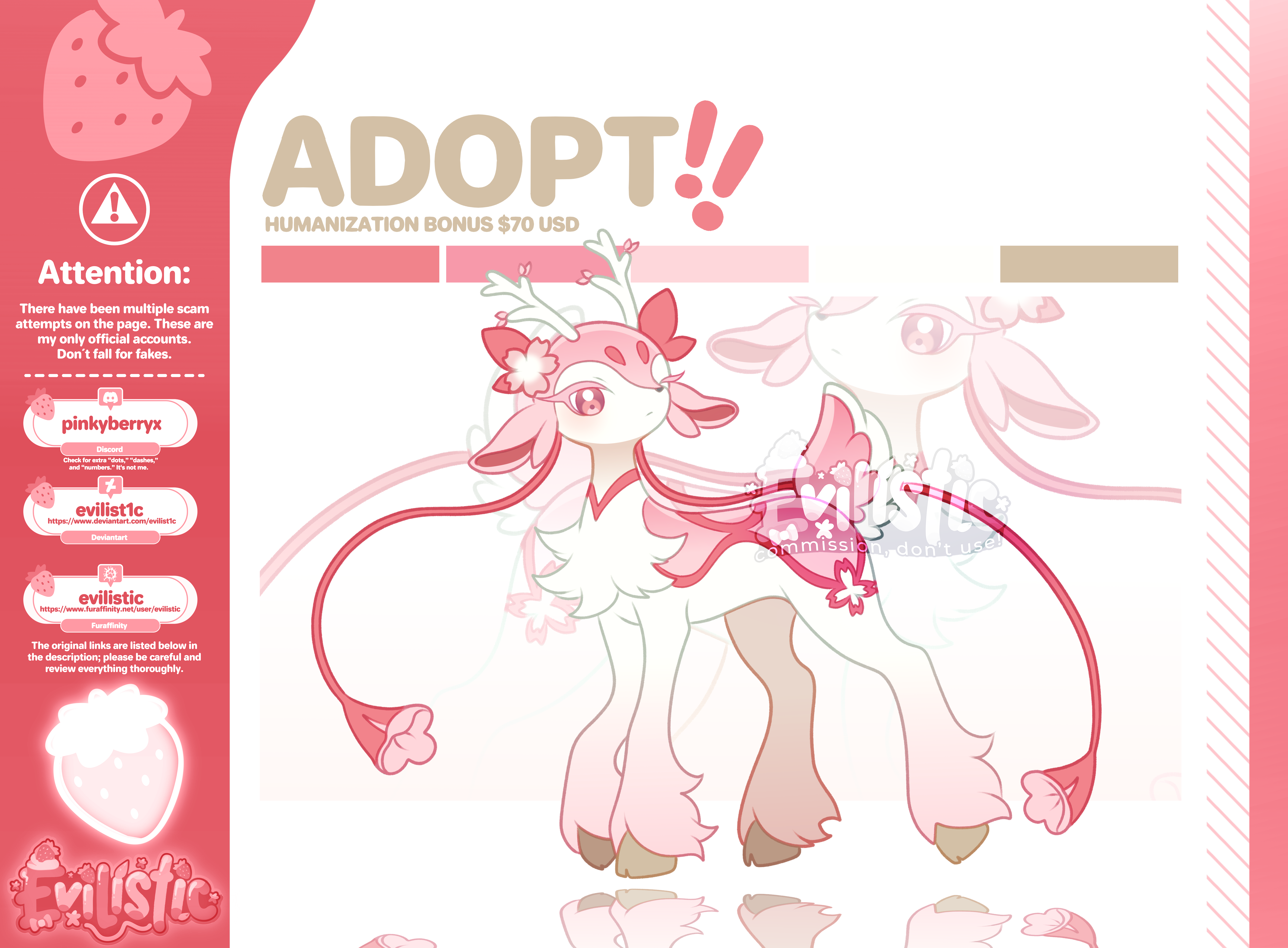 [Read the description] SB: $30 MI: $2 AB: $200 Only PayPal $30 USD: Adoptable in high quality $70 USD: Adoptable in high quality + Humanized version [or chibi] $100 USD: Special Combo Bundle! Get the Feral Illustration + Humanoid Version + Chibi Version Ko-fi: https://ko-fi.com/evilistic π¨ ATTENTION π¨ There have been recent scam attempts involving fake accounts pretending to be me. Please read carefully. Scam Tactic You Must Be Aware Of Scammers have been using a very specific strategy to trick clients: They place a bid or take the AB (Auto-Buy) over real clients. While the artist is trying to contact the supposed βwinnerβ (the scammer), the scammer rushes to message the real client claiming: That someone made a fake offer Asking if the client is still interested in the service This is NOT me. These tactics are meant to confuse and pressure you. I Will NEVER: Contact you through any platform other than my official accounts Ask you to send money to any PayPal email address Message you privately offering deals or asking for information What YOU Should Do Be cautious of any unexpected or suspicious messages. Always check: Account creation date Post history Real activity If you receive external contact, message me through my official YCH Commishes profile to confirm authenticity. If something feels off: doubt it. Your safety comes first. If you find any suspicious account pretending to be me, please inform me so I can report it. π¨Final Reminderπ¨ Scam methods can change at any moment. Stay alert and be cautious with any suspicious account or message. ββ§*ββββοΉ€*Extra Bonus:*οΉ₯ ββββ*β§β Modifications: Small edits to the original design or alternate versions (such as scars, outfit swaps, minor redesigns) [+ $10β20 USD depending on complexity] Accessories: Add items like jewelry, hats, glasses, weapons, or themed props to your character [+ $5β15 USD each] Shiny Version: A rare, alternate color palette of your character (like a special shiny form!) [+ $15 USD] Custom Icon: Perfect for social media, with a themed and expressive background [+ $25 USD] Expression [HeadShot]: +$15 USD Three pack of Expressions [HeadShot]: +$35 USD (Happy, sad, angry, surprised, kissing, winking, etc). β§β‘β§ββββ§β‘β§ββββ§β‘β§ Reviews: https://loot.commishes.com/user/profile/Evilistic/ β§β‘β§ββββ§β‘β§ββββ§β‘β§ Payment must be made within 24 hours after the auction ends!! After payment, you will get all rights to it without watermarks. Check your money wallet before bidding. Unwatermarked version will be sent after payment. It is allowed to sell, give away, or exchange between people. No refunds. Waiting list: https://trello.com/b/Z9Dvih7K/β¨-waiting-list-β¨ Furaffinity: https://www.furaffinity.net/user/evilistic Deviantart: https://www.deviantart.com/evilist1c DISCORD: pinkyberryx