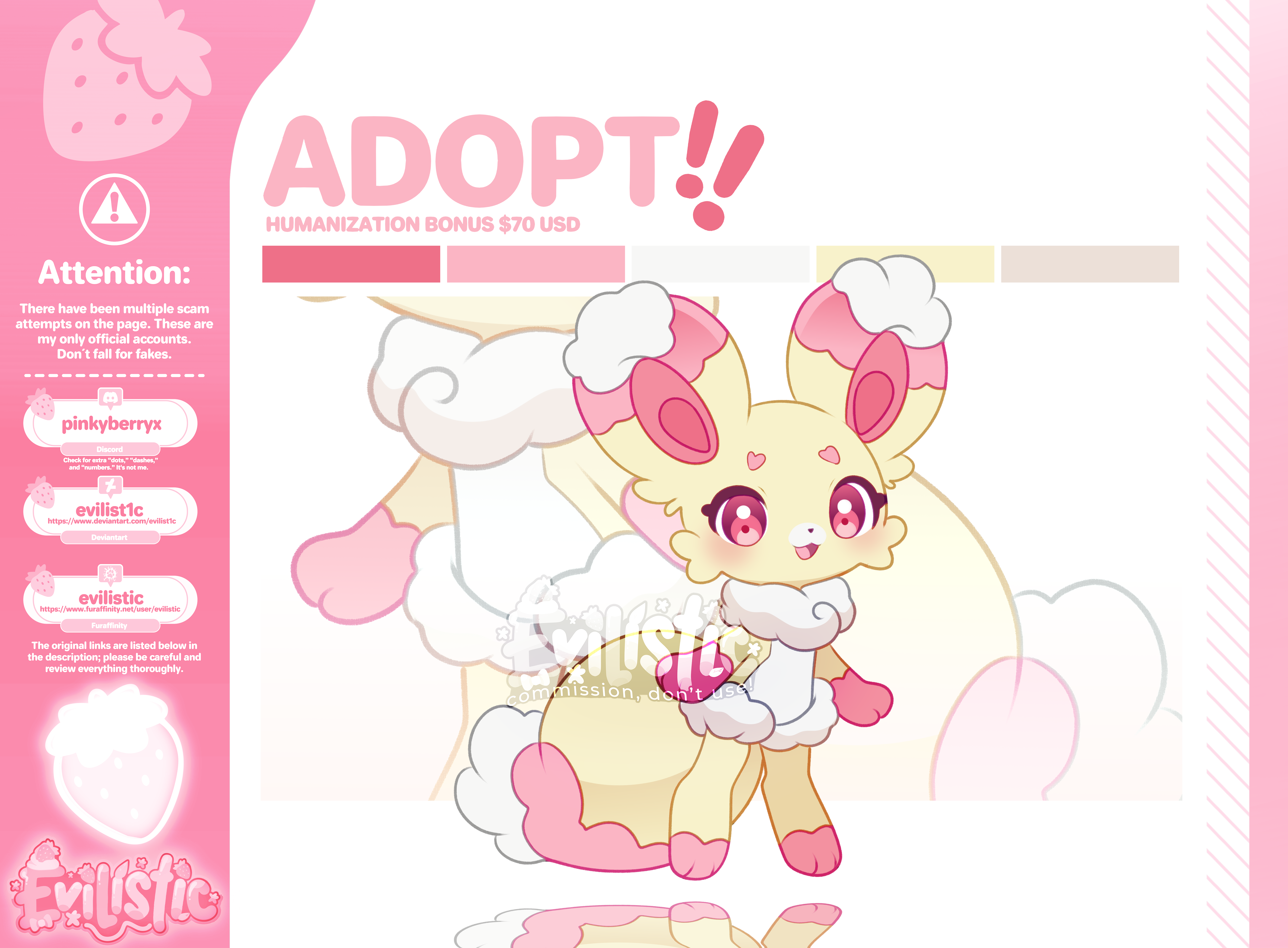 [Read the description] SB: $30 MI: $2 AB: $200 Only PayPal $30 USD: Adoptable in high quality $70 USD: Adoptable in high quality + Humanized version [or chibi] $100 USD: Special Combo Bundle! Get the Feral Illustration + Humanoid Version + Chibi Version Ko-fi: https://ko-fi.com/evilistic π¨ ATTENTION π¨ There have been recent scam attempts involving fake accounts pretending to be me. Please read carefully. Scam Tactic You Must Be Aware Of Scammers have been using a very specific strategy to trick clients: They place a bid or take the AB (Auto-Buy) over real clients. While the artist is trying to contact the supposed βwinnerβ (the scammer), the scammer rushes to message the real client claiming: That someone made a fake offer Asking if the client is still interested in the service This is NOT me. These tactics are meant to confuse and pressure you. I Will NEVER: Contact you through any platform other than my official accounts Ask you to send money to any PayPal email address Message you privately offering deals or asking for information What YOU Should Do Be cautious of any unexpected or suspicious messages. Always check: Account creation date Post history Real activity If you receive external contact, message me through my official YCH Commishes profile to confirm authenticity. If something feels off: doubt it. Your safety comes first. If you find any suspicious account pretending to be me, please inform me so I can report it. π¨Final Reminderπ¨ Scam methods can change at any moment. Stay alert and be cautious with any suspicious account or message. ββ§*ββββοΉ€*Extra Bonus:*οΉ₯ ββββ*β§β Modifications: Small edits to the original design or alternate versions (such as scars, outfit swaps, minor redesigns) [+ $10β20 USD depending on complexity] Accessories: Add items like jewelry, hats, glasses, weapons, or themed props to your character [+ $5β15 USD each] Shiny Version: A rare, alternate color palette of your character (like a special shiny form!) [+ $15 USD] Custom Icon: Perfect for social media, with a themed and expressive background [+ $25 USD] Expression [HeadShot]: +$15 USD Three pack of Expressions [HeadShot]: +$35 USD (Happy, sad, angry, surprised, kissing, winking, etc). β§β‘β§ββββ§β‘β§ββββ§β‘β§ Reviews: https://loot.commishes.com/user/profile/Evilistic/ β§β‘β§ββββ§β‘β§ββββ§β‘β§ Payment must be made within 24 hours after the auction ends!! After payment, you will get all rights to it without watermarks. Check your money wallet before bidding. Unwatermarked version will be sent after payment. It is allowed to sell, give away, or exchange between people. No refunds. Waiting list: https://trello.com/b/Z9Dvih7K/β¨-waiting-list-β¨ Furaffinity: https://www.furaffinity.net/user/evilistic Deviantart: https://www.deviantart.com/evilist1c DISCORD: pinkyberryx