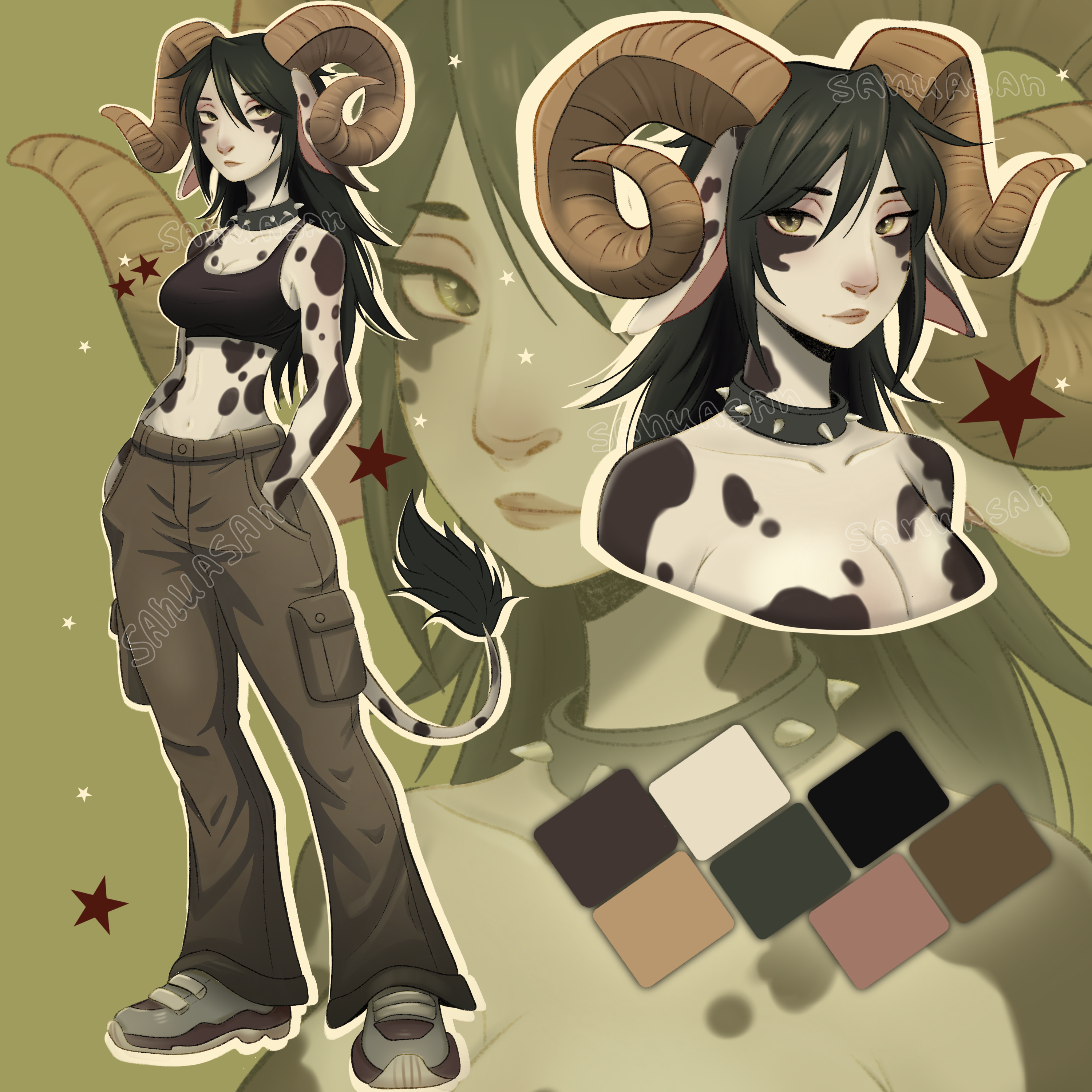 A unique hybrid of grace and grit. High-quality reference sheet with color palette. [ADOPT] Spotted Ram Rebel // Urban Fantasy Hybrid