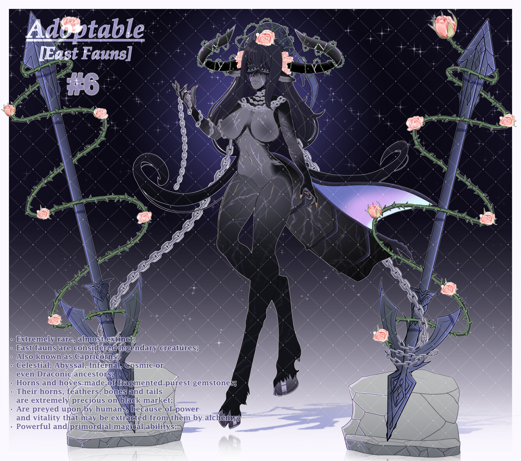 Finally got to the last pack with female fauns collection. I present to you East type of Fauns - the most rare and special type. Be my guest and take a look if you are interested. Thank you. • SB - 45$ • MB - 5$ • AB - 400$ [You will receive] • SB - Full HD original size (3500 x 3100 pix 350 dpi) PNG + with and without background + full non-commercial rights; • 100$+ - nsfw version; • 150$+ - futa version (optional) & Commercial use (game, streaming, using as vtuber, etc); • 200$+ - outfit by your reference; • 300$+ - minor changes (other hairstyle, horns, tail, etc); • AB - all above and thank you from the bottom of my heart; [Add-on] • +20 full color pallet change • +20$ breasts/hips enlarge [Add this in message] [Notes] • Payment via Paypal • 100% prepayment. • No money refund or exchange. • Payment plan is ok starting with 200$ (50% upfront), send me a message. But it can not be more than one month (4 weeks). • Auction will end in 24 hours after the last bid if no timer. • Payment in 24 hours after the auction is finished. If not, I will be forced to re-open the auction again or contact the previous bidder. • If using for commercial purposes, place my nickname in the description. Thank you and good luck!