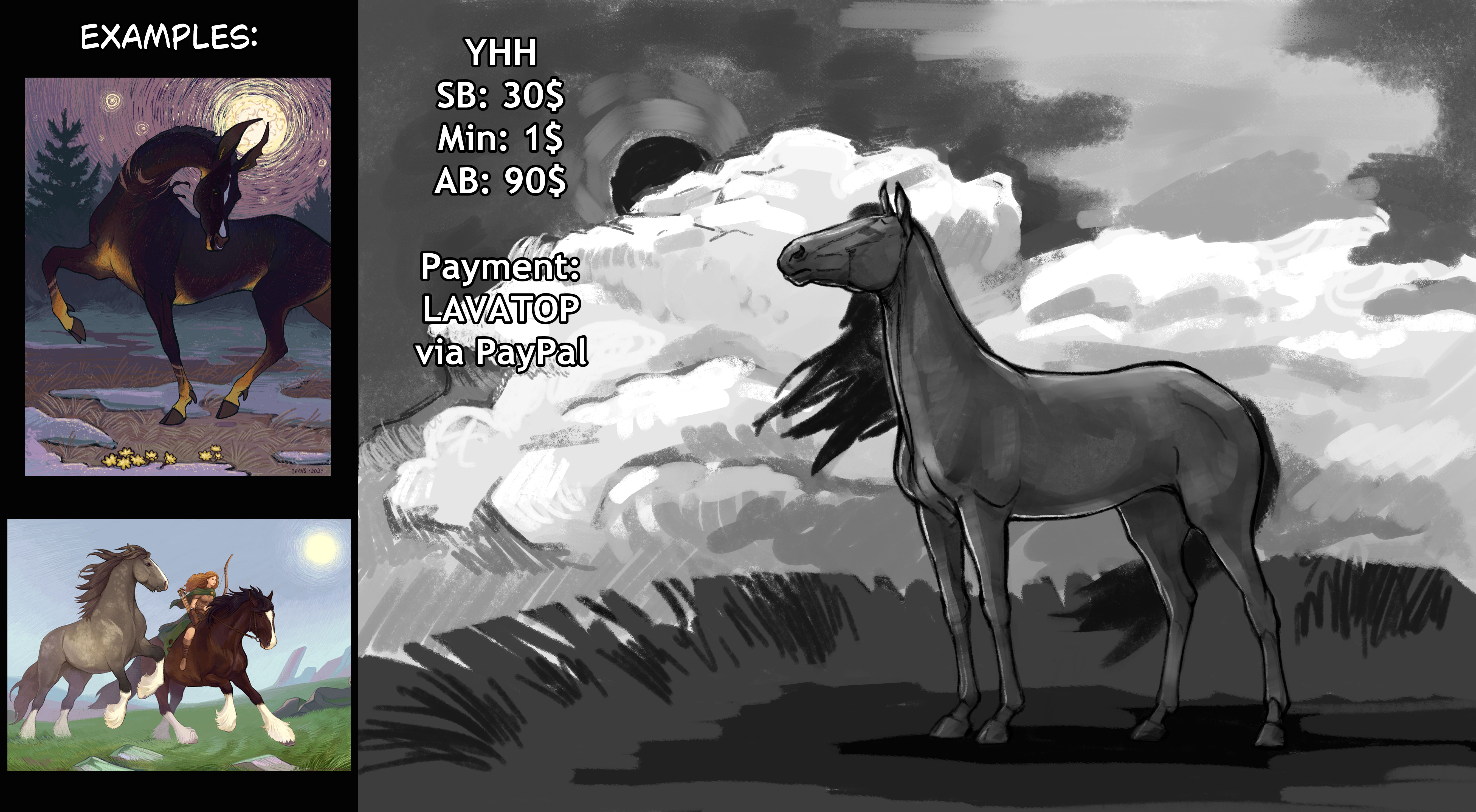 Full background details, color matching for your character, horns and wings are included in the final price. Additional changes to the composition are available for AB. Available for any horse characters and equine species! Full prepayment via LavaTop (PayPal). Deadline 3-4 weeks. The auction on DA: https://www.deviantart.com/silentshans/art/OPEN-YHH-1304571484 The auction on FA: https://www.furaffinity.net/view/64176178/