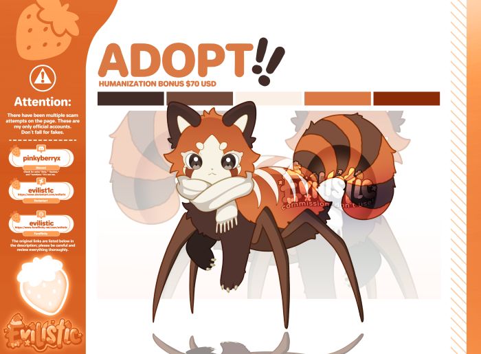 [Read the description] SB: $30 MI: $2 AB: $200 Only PayPal $30 USD: Adoptable in high quality $70 USD: Adoptable in high quality + Humanized version [or chibi] $100 USD: Special Combo Bundle! Get the Feral Illustration + Humanoid Version + Chibi Version Ko-fi: https://ko-fi.com/evilistic π¨ ATTENTION π¨ There have been recent scam attempts involving fake accounts pretending to be me. Please read carefully. Scam Tactic You Must Be Aware Of Scammers have been using a very specific strategy to trick clients: They place a bid or take the AB (Auto-Buy) over real clients. While the artist is trying to contact the supposed βwinnerβ (the scammer), the scammer rushes to message the real client claiming: That someone made a fake offer Asking if the client is still interested in the service This is NOT me. These tactics are meant to confuse and pressure you. I Will NEVER: Contact you through any platform other than my official accounts Ask you to send money to any PayPal email address Message you privately offering deals or asking for information What YOU Should Do Be cautious of any unexpected or suspicious messages. Always check: Account creation date Post history Real activity If you receive external contact, message me through my official YCH Commishes profile to confirm authenticity. If something feels off: doubt it. Your safety comes first. If you find any suspicious account pretending to be me, please inform me so I can report it. π¨Final Reminderπ¨ Scam methods can change at any moment. Stay alert and be cautious with any suspicious account or message. ββ§*ββββοΉ€*Extra Bonus:*οΉ₯ ββββ*β§β Modifications: Small edits to the original design or alternate versions (such as scars, outfit swaps, minor redesigns) [+ $10β20 USD depending on complexity] Accessories: Add items like jewelry, hats, glasses, weapons, or themed props to your character [+ $5β15 USD each] Shiny Version: A rare, alternate color palette of your character (like a special shiny form!) [+ $15 USD] Custom Icon: Perfect for social media, with a themed and expressive background [+ $25 USD] Expression [HeadShot]: +$15 USD Three pack of Expressions [HeadShot]: +$35 USD (Happy, sad, angry, surprised, kissing, winking, etc). β§β‘β§ββββ§β‘β§ββββ§β‘β§ Reviews: https://loot.commishes.com/user/profile/Evilistic/ β§β‘β§ββββ§β‘β§ββββ§β‘β§ Payment must be made within 24 hours after the auction ends!! After payment, you will get all rights to it without watermarks. Check your money wallet before bidding. Unwatermarked version will be sent after payment. It is allowed to sell, give away, or exchange between people. No refunds. Waiting list: https://trello.com/b/Z9Dvih7K/β¨-waiting-list-β¨ Furaffinity: https://www.furaffinity.net/user/evilistic Deviantart: https://www.deviantart.com/evilist1c DISCORD: pinkyberryx