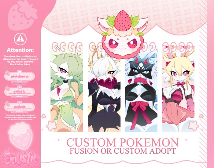 SB: $50 MI: $2 AB: $200 Only PayPal ₊°︶︶︶︶︶︶︶︶︶︶︶︶︶︶︶︶︶︶︶︶︶︶︶︶︶︶︶︶ ‧₊˚ This slot is used to request a humanoid version of the pokemon or a custom Pokefusion that involves the exclusive fusion of two Pokémons in order to give life to a completely new Pokémon design or concept. In this process, you will be able to select the Pokémon of your choice and I, as a result, combine them incorporating elements of each one of them. This resulting fusion can cover various aspects, such as physical characteristics, colors, abilities, and any other details typical of the original Pokémon. ₊°︶︶︶︶︶︶︶︶︶︶︶︶︶︶︶︶︶︶︶︶︶︶︶︶︶︶︶︶ ‧₊˚ $50: Custom / fusion *Surprise result* You can choose the pokemon or pokemon to merge and the result will be a complete surprise. (No changes or descriptions apply) $70: Custom / fusion completely personalized, includes revision of the sketch before the final result. $140: Evolution included ⋆⛧*┈┈┈┈﹤*Extra Bonus:*﹥ ┈┈┈┈*⛧⋆ Expression [HeadShot]: +$15 USD Three pack of Expressions [HeadShot]: +$35 USD (Happy, sad, angry, surprised, kissing, winking, etc). Character Sheet [Basic Front Pose]: +$70 USD Character Sheet [Basic Front and Rear Pose]: +$130 USD Feral Version: +$30 USD ✧♡✧━━━✧♡✧━━━✧♡✧ Reviews: https://loot.commishes.com/user/profile/Evilistic ✧♡✧━━━✧♡✧━━━✧♡✧ Payment must be made within 24 hours after the auction ends!! After payment, you will get all rights to it without watermarks. Check your money wallet before bidding. Unwatermarked version will be sent after payment. It is allowed to sell, give away, or exchange between people. No refunds. Waiting list: https://trello.com/b/Z9Dvih7K/waiting-list-⏳🌸 Furaffinity: www.furaffinity.../evilistic Deviantart: www.deviantart..../evilist1c DISCORD: pinkyberryx