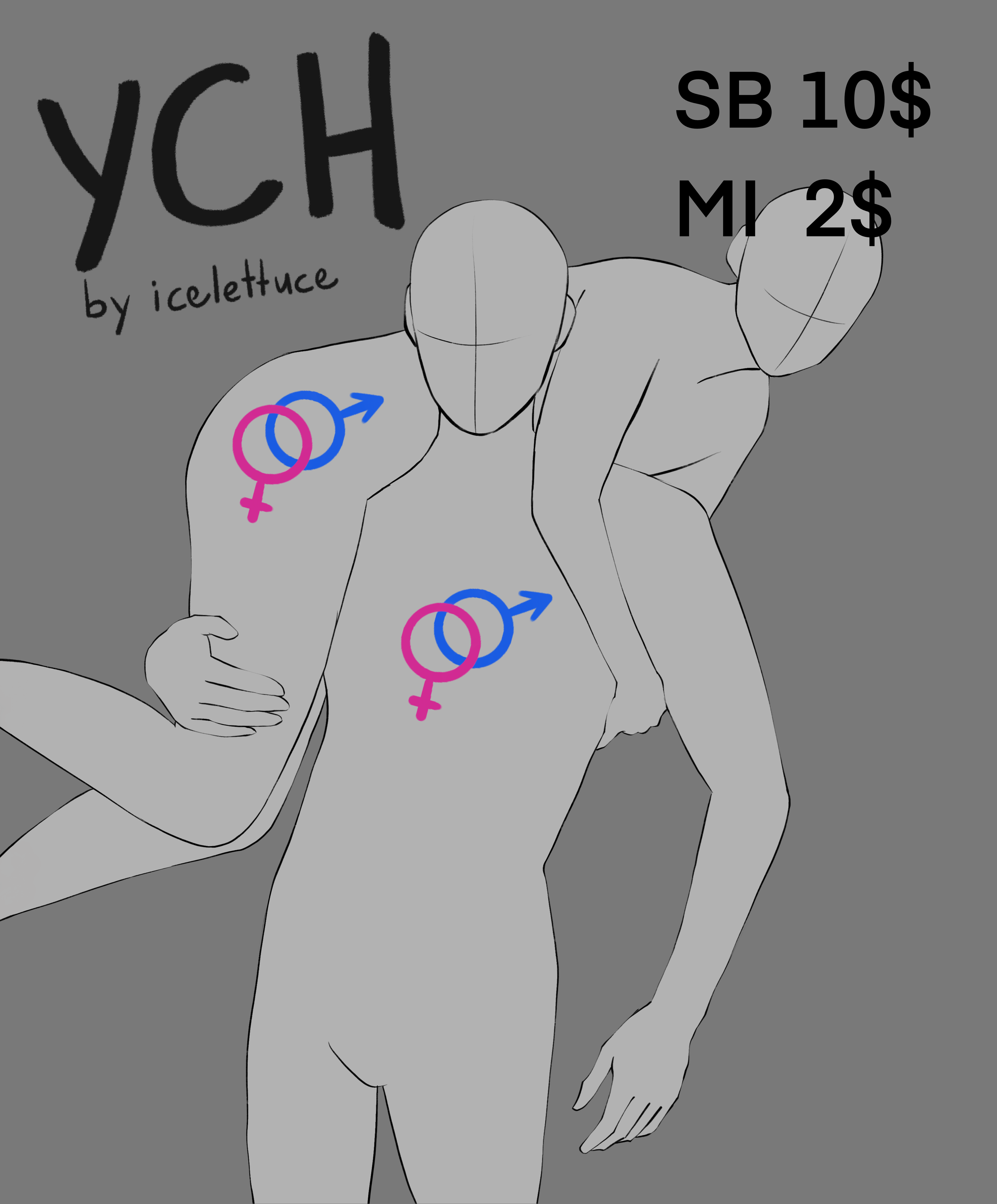 SB: 10$ MI: 2$ AB -$ SLOT 1 SB https://ych.commishes.com/auction/show/599O1/ych-auction-2-slots/ SLOT 2 (THIS) - Auction will be closed 24 hours after last bid - Any gender - No refunds - Any characters - Emotions can be changed -payment ONLY by PAYPAL this auction on other platforms: YCH.ART https://ych.art/auction/234641/slot/1 https://ych.art/auction/234641/slot/2 DEVIANTART https://www.deviantart.com/icelettuce/art/AUCTION-OPEN-Couple-YCH-2-Slots-1307512530