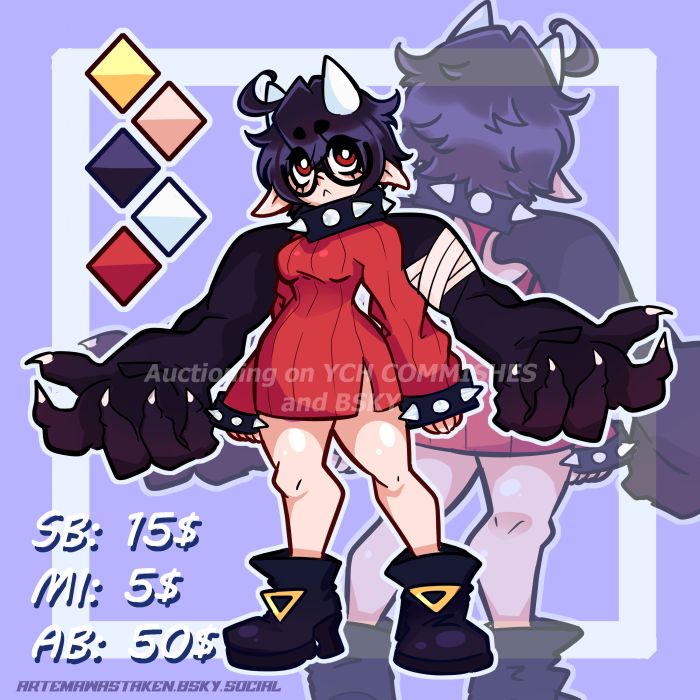 SB: 15$ MI: 5$ AB: 50$ You can ask for small modifications on the character for free (more accesories, change colors, etc. Also comes with the back reference in a full image You get the Image in various versions, blank png, without prices and watermark, and a version with the two views. 30$ and above for a free fullbody drawing of the character in any pose/expression/etc you like 50$ AB TOS: Contact me before 48h of end of auction Paypal only please! You have all comercial rights, right to modify, resell... etc Any questions on md or Bluesky! Contacts: Eulaliafiend on Telegram Artemita_ on Discord @artemawastaken.bsky.social on Bluesky