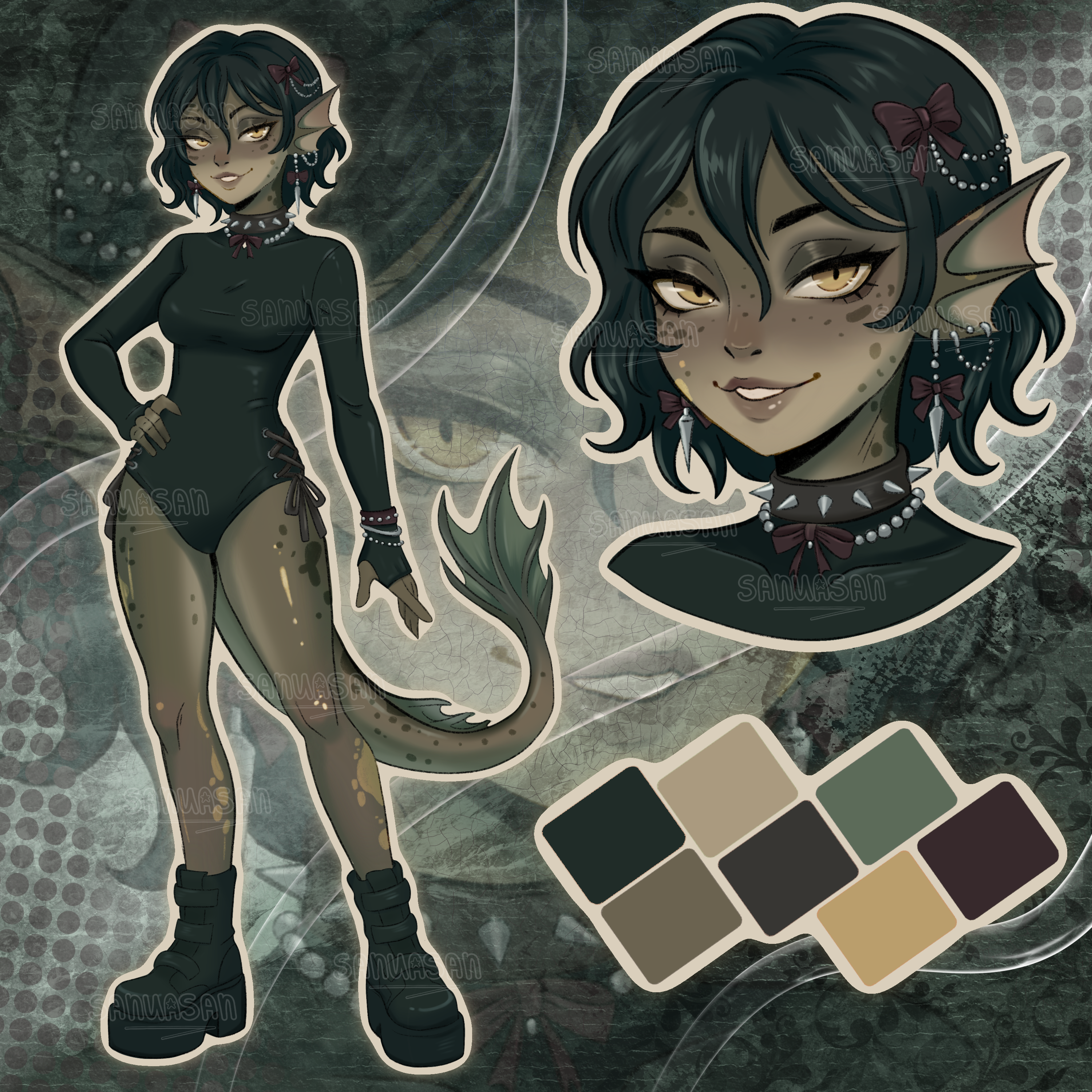 A sly aquatic girl with a playful but dangerous charm. Her fin-like ears, spotted skin and sleek tail hint at a life spent in deep waters, while her confident smile suggests she always knows more than she lets on. Design includes: • Fullbody reference • Portrait • Color palette Bidding SB: $35 MI: $3 $65+ Buyer can choose NSFW or SFW nude (doll style) version of the base pose. $90+ Custom bonus (buyer’s choice): • Custom pose + outfit OR • Custom NSFW