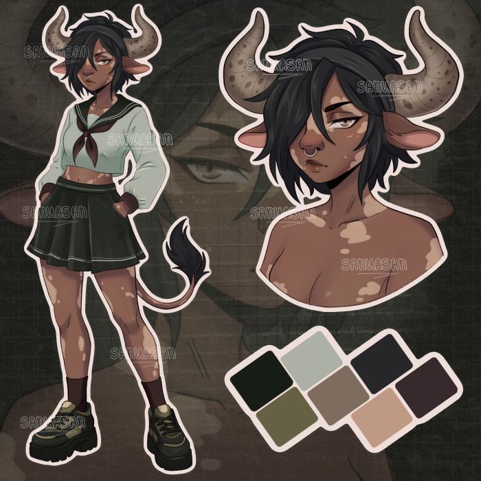 A calm but strong-looking horned minotaur girl with large curved horns, soft vitiligo markings and a natural earthy color palette. Her relaxed expression gives her a mysterious and slightly intimidating presence. Design includes: • Fullbody reference • Portrait • Color palette Bidding SB: $30 MI: $3 $65+ Buyer can choose NSFW or SFW nude (doll style) version of the base pose. $90+ Custom bonus (buyer’s choice): • Custom pose + outfit OR • Custom NSFW