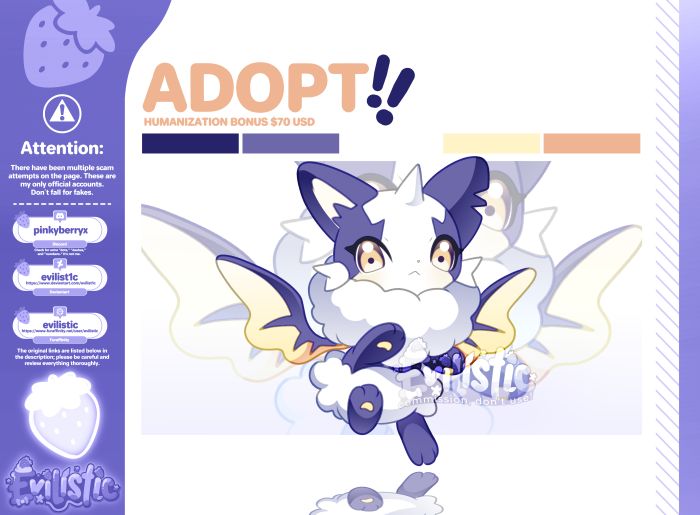 [Read the description] SB: $25 MI: $2 AB: $200 Only PayPal $25 USD: Adoptable in high quality $70 USD: Adoptable in high quality + Humanized version [or chibi] $100 USD: Special Combo Bundle! Get the Feral Illustration + Humanoid Version + Chibi Version Ko-fi: https://ko-fi.com/evilistic π¨ ATTENTION π¨ There have been recent scam attempts involving fake accounts pretending to be me. Please read carefully. Scam Tactic You Must Be Aware Of Scammers have been using a very specific strategy to trick clients: They place a bid or take the AB (Auto-Buy) over real clients. While the artist is trying to contact the supposed βwinnerβ (the scammer), the scammer rushes to message the real client claiming: That someone made a fake offer Asking if the client is still interested in the service This is NOT me. These tactics are meant to confuse and pressure you. I Will NEVER: Contact you through any platform other than my official accounts Ask you to send money to any PayPal email address Message you privately offering deals or asking for information What YOU Should Do Be cautious of any unexpected or suspicious messages. Always check: Account creation date Post history Real activity If you receive external contact, message me through my official YCH Commishes profile to confirm authenticity. If something feels off: doubt it. Your safety comes first. If you find any suspicious account pretending to be me, please inform me so I can report it. π¨Final Reminderπ¨ Scam methods can change at any moment. Stay alert and be cautious with any suspicious account or message. ββ§*ββββοΉ€*Extra Bonus:*οΉ₯ ββββ*β§β Modifications: Small edits to the original design or alternate versions (such as scars, outfit swaps, minor redesigns) [+ $10β20 USD depending on complexity] Accessories: Add items like jewelry, hats, glasses, weapons, or themed props to your character [+ $5β15 USD each] Shiny Version: A rare, alternate color palette of your character (like a special shiny form!) [+ $15 USD] Custom Icon: Perfect for social media, with a themed and expressive background [+ $25 USD] Expression [HeadShot]: +$15 USD Three pack of Expressions [HeadShot]: +$35 USD (Happy, sad, angry, surprised, kissing, winking, etc). β§β‘β§ββββ§β‘β§ββββ§β‘β§ Reviews: https://loot.commishes.com/user/profile/Evilistic/ β§β‘β§ββββ§β‘β§ββββ§β‘β§ Payment must be made within 24 hours after the auction ends!! After payment, you will get all rights to it without watermarks. Check your money wallet before bidding. Unwatermarked version will be sent after payment. It is allowed to sell, give away, or exchange between people. No refunds. Waiting list: https://trello.com/b/Z9Dvih7K/β¨-waiting-list-β¨ Furaffinity: https://www.furaffinity.net/user/evilistic Deviantart: https://www.deviantart.com/evilist1c DISCORD: pinkyberryx
