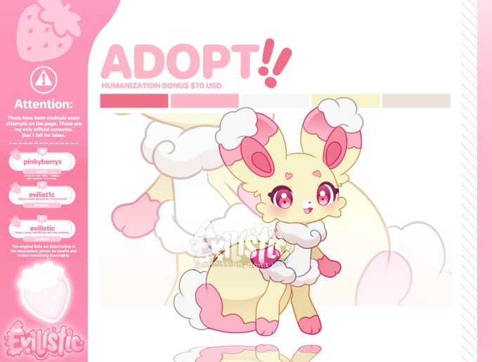 [Read the description] SB: $25 MI: $2 AB: $200 Only PayPal $25 USD: Adoptable in high quality $70 USD: Adoptable in high quality + Humanized version [or chibi] $100 USD: Special Combo Bundle! Get the Feral Illustration + Humanoid Version + Chibi Version Ko-fi: https://ko-fi.com/evilistic π¨ ATTENTION π¨ There have been recent scam attempts involving fake accounts pretending to be me. Please read carefully. Scam Tactic You Must Be Aware Of Scammers have been using a very specific strategy to trick clients: They place a bid or take the AB (Auto-Buy) over real clients. While the artist is trying to contact the supposed βwinnerβ (the scammer), the scammer rushes to message the real client claiming: That someone made a fake offer Asking if the client is still interested in the service This is NOT me. These tactics are meant to confuse and pressure you. I Will NEVER: Contact you through any platform other than my official accounts Ask you to send money to any PayPal email address Message you privately offering deals or asking for information What YOU Should Do Be cautious of any unexpected or suspicious messages. Always check: Account creation date Post history Real activity If you receive external contact, message me through my official YCH Commishes profile to confirm authenticity. If something feels off: doubt it. Your safety comes first. If you find any suspicious account pretending to be me, please inform me so I can report it. π¨Final Reminderπ¨ Scam methods can change at any moment. Stay alert and be cautious with any suspicious account or message. ββ§*ββββοΉ€*Extra Bonus:*οΉ₯ ββββ*β§β Modifications: Small edits to the original design or alternate versions (such as scars, outfit swaps, minor redesigns) [+ $10β20 USD depending on complexity] Accessories: Add items like jewelry, hats, glasses, weapons, or themed props to your character [+ $5β15 USD each] Shiny Version: A rare, alternate color palette of your character (like a special shiny form!) [+ $15 USD] Custom Icon: Perfect for social media, with a themed and expressive background [+ $25 USD] Expression [HeadShot]: +$15 USD Three pack of Expressions [HeadShot]: +$35 USD (Happy, sad, angry, surprised, kissing, winking, etc). β§β‘β§ββββ§β‘β§ββββ§β‘β§ Reviews: https://loot.commishes.com/user/profile/Evilistic/ β§β‘β§ββββ§β‘β§ββββ§β‘β§ Payment must be made within 24 hours after the auction ends!! After payment, you will get all rights to it without watermarks. Check your money wallet before bidding. Unwatermarked version will be sent after payment. It is allowed to sell, give away, or exchange between people. No refunds. Waiting list: https://trello.com/b/Z9Dvih7K/β¨-waiting-list-β¨ Furaffinity: https://www.furaffinity.net/user/evilistic Deviantart: https://www.deviantart.com/evilist1c DISCORD: pinkyberryx