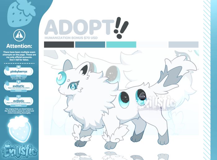 [Read the description] SB: $30 MI: $2 AB: $200 Only PayPal $30 USD: Adoptable in high quality $70 USD: Adoptable in high quality + Humanized version [or chibi] $100 USD: Special Combo Bundle! Get the Feral Illustration + Humanoid Version + Chibi Version Ko-fi: https://ko-fi.com/evilistic π¨ ATTENTION π¨ There have been recent scam attempts involving fake accounts pretending to be me. Please read carefully. Scam Tactic You Must Be Aware Of Scammers have been using a very specific strategy to trick clients: They place a bid or take the AB (Auto-Buy) over real clients. While the artist is trying to contact the supposed βwinnerβ (the scammer), the scammer rushes to message the real client claiming: That someone made a fake offer Asking if the client is still interested in the service This is NOT me. These tactics are meant to confuse and pressure you. I Will NEVER: Contact you through any platform other than my official accounts Ask you to send money to any PayPal email address Message you privately offering deals or asking for information What YOU Should Do Be cautious of any unexpected or suspicious messages. Always check: Account creation date Post history Real activity If you receive external contact, message me through my official YCH Commishes profile to confirm authenticity. If something feels off: doubt it. Your safety comes first. If you find any suspicious account pretending to be me, please inform me so I can report it. π¨Final Reminderπ¨ Scam methods can change at any moment. Stay alert and be cautious with any suspicious account or message. ββ§*ββββοΉ€*Extra Bonus:*οΉ₯ ββββ*β§β Modifications: Small edits to the original design or alternate versions (such as scars, outfit swaps, minor redesigns) [+ $10β20 USD depending on complexity] Accessories: Add items like jewelry, hats, glasses, weapons, or themed props to your character [+ $5β15 USD each] Shiny Version: A rare, alternate color palette of your character (like a special shiny form!) [+ $15 USD] Custom Icon: Perfect for social media, with a themed and expressive background [+ $25 USD] Expression [HeadShot]: +$15 USD Three pack of Expressions [HeadShot]: +$35 USD (Happy, sad, angry, surprised, kissing, winking, etc). β§β‘β§ββββ§β‘β§ββββ§β‘β§ Reviews: https://loot.commishes.com/user/profile/Evilistic/ β§β‘β§ββββ§β‘β§ββββ§β‘β§ Payment must be made within 24 hours after the auction ends!! After payment, you will get all rights to it without watermarks. Check your money wallet before bidding. Unwatermarked version will be sent after payment. It is allowed to sell, give away, or exchange between people. No refunds. Waiting list: https://trello.com/b/Z9Dvih7K/β¨-waiting-list-β¨ Furaffinity: https://www.furaffinity.net/user/evilistic Deviantart: https://www.deviantart.com/evilist1c DISCORD: pinkyberryx