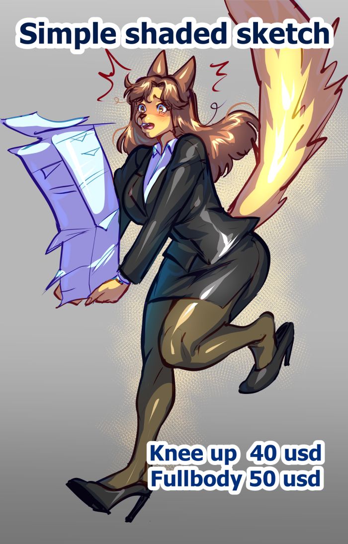 it's like the flat color sketches but shaded ___ 40 usd- knee up ____ 50 usd- fullbody -backgrounds: around 15 usd depending on complexity -extras: same about working with me: https://www.furaffinity.net/commissions/yuwi-cyu Fa: https://www.furaffinity.net/user/yuwi-cyu check my wife's stuff: https://www.furaffinity.net/user/makum payment methods: paypal , stripe , payoneer