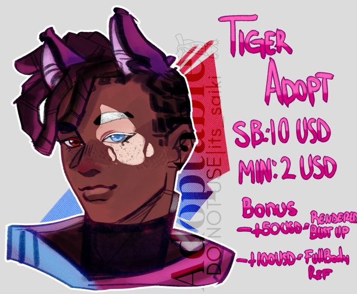 ✦ SB: $5.00 ✦ Min: $2 ✦ AB: $150+ Full character reference sheet (front and back)+ headshot BONUS: +50 USD Free rendered bust up/headshot + 100 USD Fullbody reference ------------------------------------------------------------------------- Rules: - Payment can be done via Paypal or Vgen. - Do not edit comments on bets. - Sold adopters cannot be returned. - If the auction reaches more than $100 USD, there may be a payment plan. (an initial payment is required or there may be a payment date, if passing the date there is no response the adoptable will return to be sold) - You can gift it or resell for the same or lower price (If you wish to add commissions to the total price you must indicate the price of each piece.) - DON'T copy, steal or trace my desings or base. - Change few things about the design (like more outfits and hairstyles). In case the original design is unrecognizable, please credit to me. - Free give them the gender/name you want and use them for role play - The winner will receive adopt without watermarks and without background. - My discord: itssaiki. - My Twitter: https://twitter.com/its_saiki - My vgen: https://vgen.co/itsSaiki