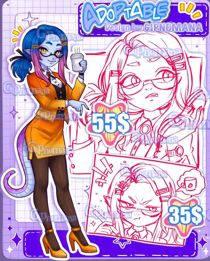 The reason for re-posting the auction is a false bid. ✧ ⭐️ PAYMENT VIA ⭐️✧ [Payments only via] - Boosty (Bank cards only) - HipoLink (Bank cards and virtual cards of PayPal, Wise, Revolut, CashApp and Klarna) ✧====================================== Only serious bids ✧ ✧ ✧ ⭐️⭐️ NO REFUNDS. ⭐️ ⭐️ ✧ ✧ ✧ ✧======================================✧ ✧SB: 1$ ✧Min: 1$ ✧35$+ color version ✧ 55$+ color version ✧AB 150$ (+commercial use + PSD ) ✧ examples of finished works ✧ https://portfolio.commishes.com/upload/show/1NUK5/ https://portfolio.commishes.com/upload/show/1NUMK/ https://portfolio.commishes.com/upload/show/1NN23/ deadline: for drawing in color will start when the bid is placed, so it will take a little time, thank you for understanding. ✧======================================✧ you will receive SB- only character Additional drawing when betting on it ✧====================✧ Payment must be made in 24hrs after auction ending,if you need more time to pay, write about it ---------------------------------------------------------------- The link will direct you to the reviews of my clients: - https://loot.commishes.com/testimonial/on/GIPNOMANAOff/ ✧======================================✧ due to different time zones, I may not answer right away, don't worry, if possible I will answer you right away ✧ do not claim the design as your own, since I am the author of the design ✧ - Reselling is allowed, but only at or below the original purchase price. No reselling for a higher price than bought ✧ Always double-check the account before replying! ✧ commercial use allowed only for AB ✧ I have the right to post the images of my adoptable on my social networks. ✧ Important :✧ I don't change the design of the character, and I don't finish anything, the only thing I can do is remove some element (for example, hairpins, ears, horns, jewelry, small elements