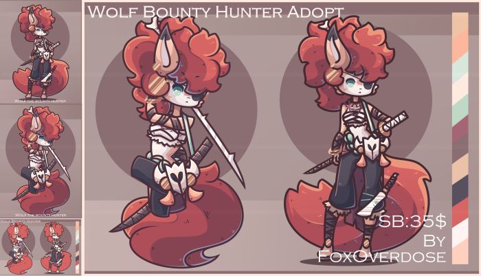 SB: 35$ Min: 2$ AB: 300$ Loot: https://loot.commishes.com/user/profile/FoxOverdose - Payment through Boosty (Stripe) or Hipolink (Card) The buyer will receive a full-size image without watermarks + all additional full-size art displayed on the banner on the left with and without captions + Versions on a transparent background Extras: From 45$ Possibility to remove and add any minor details $70 The above + any new weapon + plus the ability to customize the existing one $100 All the above advantages + Half body art (line art + basic shading) of this character AB All + fullbody fullrender illustration with this character + editable PSD file + commercial rights Reference list: +$215 to your bid (fullrender - Front view, back view, three emotional references + color reference) Example reference sheet: https://portfolio.commishes.com/upload/show/1MTKJ/ Examples of full-render works: https://portfolio.commishes.com/upload/show/1MTKF/ https://portfolio.commishes.com/upload/show/1MTKD/ https://portfolio.commishes.com/upload/show/1BIID/ More in my portfolio Examples of half body art line + basic shading: https://portfolio.commishes.com/upload/show/1MTKM/ Rules: - The auction will last for 1 day - Payment must be made within 48 hours - Payment plan for bets over $70 - You can resell the character - No refund For any questions: - Discord: dfox7460 - Mail: [email protected] - Or send me a note via DeviantArt: https://www.deviantart.com/foxoverdose The auction it's also hosted on: FA: https://www.furaffinity.net/view/63054394/ DA: https://www.deviantart.com/foxoverdose/art/OPEN-Wolf-Bounty-Hunter-Adopt-auction-1266485414
