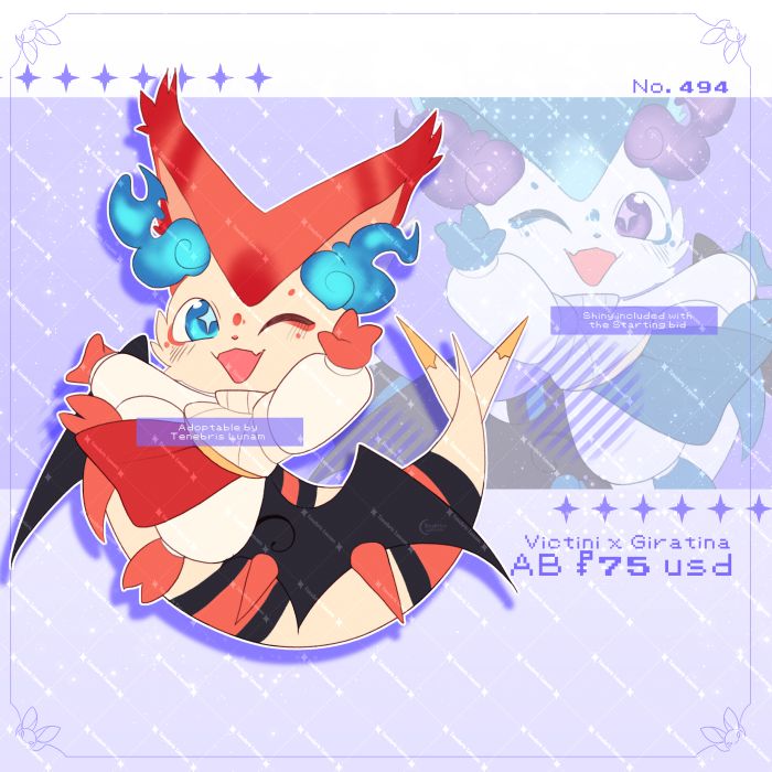 Hiii everyone~ New babies available! Make sure you read the rules and specifications on prices!~ Remember to join my discord server to be tagged when I upload more beans, as well as exclusive auctions! discord.gg/Xy6X9QUPwU And by being a Ko-fi support (of any level) you get the chance of pre-claim for a little less! *Shiny is included with the pucharse BUT having new files turned shiny will cost an adittion of $5 (addition to the total price) *TENEBRIS LUNAM AND ELIBAT'S BIDS ARE FROM OTHER SITES - DA/FA: Bid in chain/respond to previous bidder of same bean. 1. Mew x Arceus 2. Victini x Giratina 3. Magic Rainbow Braixen 4. Corrupted Angel Dragonair 5. Moon Zoroark 6. Half Wyver Absol x Black Hole Each: SB: $25 MIN: $2 AB : $75 - You'll obtain 1 Extra fullbody of the character (Either of those can be changed to the other stages if they have any, such as evolution or pre evolutions) + Icon OR Chibi AB2: $190- (Previous rewards) + Bust + Extra fullbody + free color changes or small changes + Shiny + Icon or Chibi AB3* $250 - (Previous Rewards)+ Human/Anthro/Feral Character Sheet. Sheet is of back and front view with some accessories or close ups. *AB2 AND AB3 DOES NOT OVERRIDE AB! THEY ARE ALTERNATE OPTIONS. <—— ANOTHER INFORMATION ——> Crossposted on: Deviantart: https://www.deviantart.com/tenebrislunam/art/1311764311 Furaffinity: https://www.furaffinity.net/view/64384165/ Tumblr: https://www.tumblr.com/tenebrislunam/811573524641841152 RULES/TOS: https://tenebrislunam.carrd.co/#about Pokemon is owned by the Pokemon Company, Nintendo and GameFreak. We are not associated with them in any way. We own these designs. Art by Tenebris Lunam