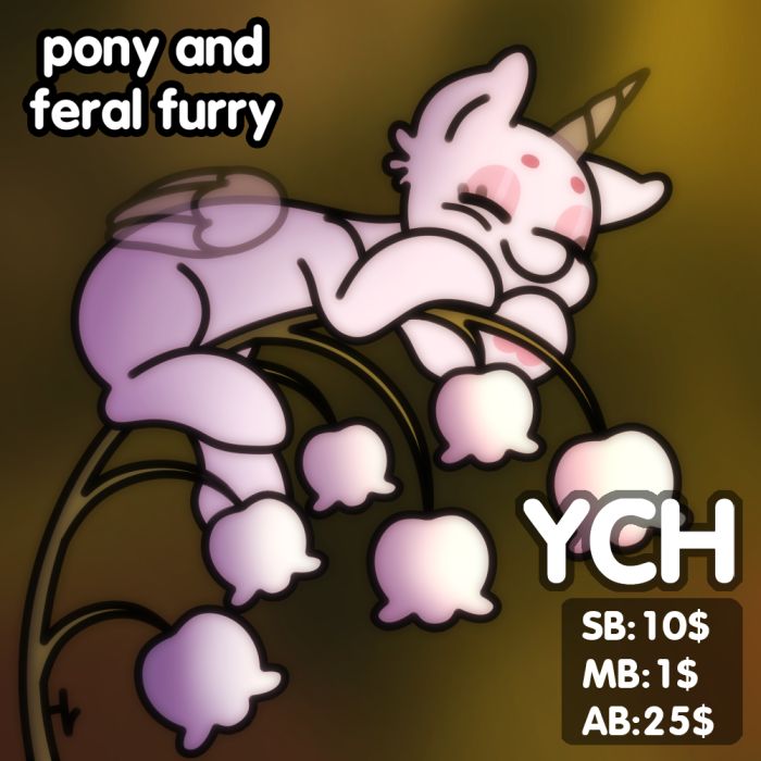 Simple Pony Lilies of the valley YCH 🎠 SB: 10$ 🎠 MB: 1$ 🎠 AB: 25$ AutoBuy: ● you can change emotion ● you can add any SFW text to the drawing ● you can change shade of green color ● you DON'T NEED to pay +10$ for difficult character Loot: https://loot.commishes.com/user/profile/nikuri/ 💜 Custom commissions are open 💜 ✿ *+:。.。 (๑ᵔс ᵔ๑) 。.。:+* ✿ 🦄 Payment ONLY via Boosty (by CARD) in 48 hours. Prepayment 100% 🦄 ALL races of pony and feral furry are accepted 🦄 NO refunds 🦄 When the auction ends, I send you message with general info for payment and after that before payment you need to send me your characters references for the drawing (and only after my respond you send the funds) 🦄 If the auction winner does not respond within 24 hours, then your place goes to the owner of the previous bid 🦄 Simple edits free, but each subsequent difficult edit +5$ 🦄 You need to pay +10$ for difficult character Connection with me: 🐴 Telegram: (nikurya) http://t.me/nikurya 🐴 Discord: (nikurya) https://discordapp.com/users/804642042520797190 🐴 CRM: https://crm.commishes.com/commission/nikuri/ ✿ *+:。.。 (๑ᵔс ᵔ๑) 。.。:+* ✿ CROSSPOSTING IS PRESENT IN: 🍬 Boosty: https://boosty.to/nikuri/about 🍬 DeviantArt: https://www.deviantart.com/nikuriii 🍬 FurAffinity: https://www.furaffinity.net/user/nikuri