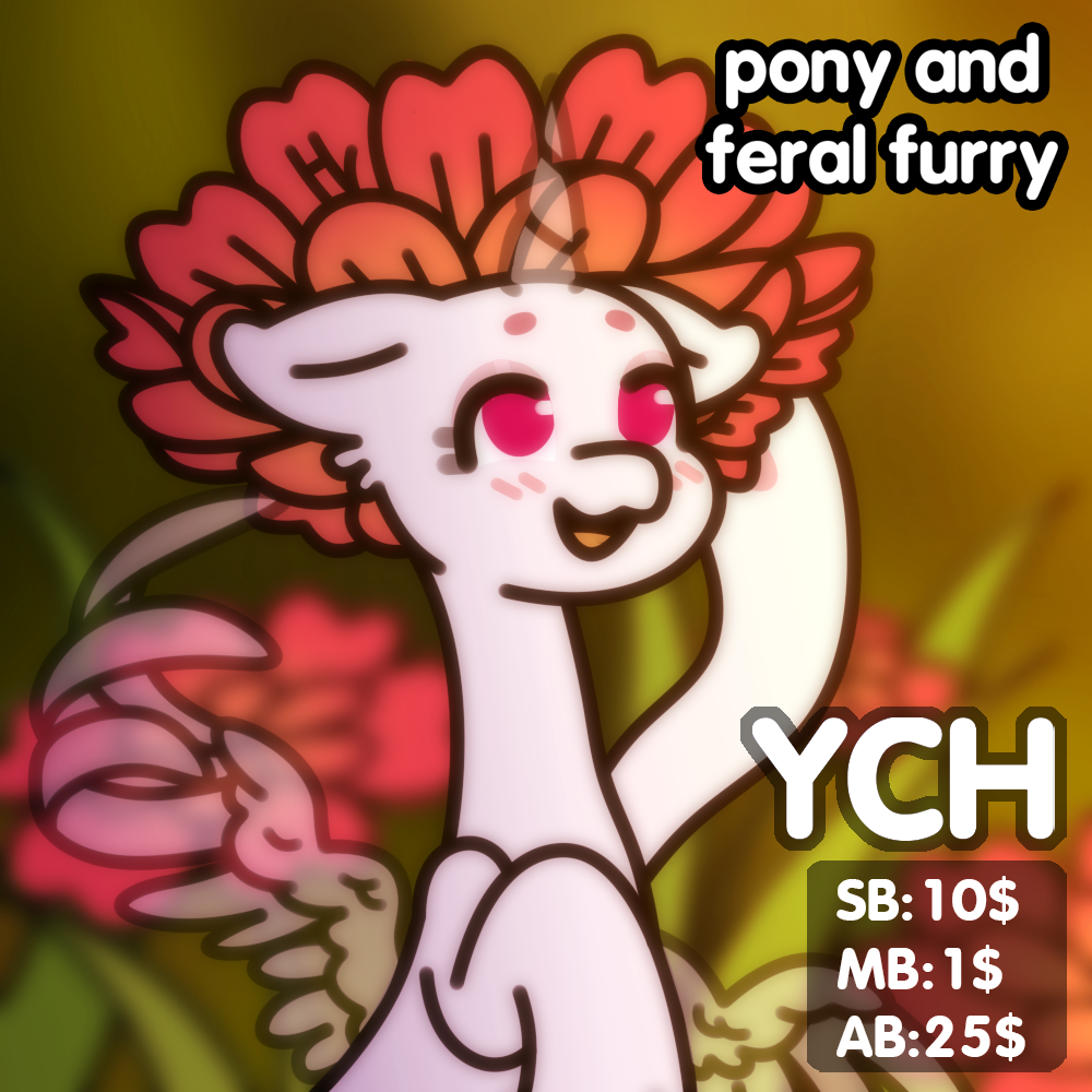 Simple Pony Flower hat YCH 🎠 SB: 10$ 🎠 MB: 1$ 🎠 AB: 25$ AutoBuy: ● you can change emotion ● you can add any SFW text at the drawing ● you can change shade of green color ● you can change color palette of flowers ● you DON'T NEED to pay +10$ for difficult character Loot: https://loot.commishes.com/user/profile/nikuri/ 💜 Custom commissions are open 💜 ✿ *+:。.。 (๑ᵔс ᵔ๑) 。.。:+* ✿ 🦄 Payment ONLY via Boosty (by CARD) in 48 hours. Prepayment 100% 🦄 Deadline 1 week 🦄 ALL races of pony and feral furry are accepted 🦄 NO refunds 🦄 When the auction ends, I send you message with general info for payment and after that before payment you need to send me your characters references for the drawing (and only after my respond you send the funds) 🦄 If the auction winner does not respond within 24 hours, then your place goes to the owner of the previous bid 🦄 Simple edits free, but each subsequent difficult edit +5$ 🦄 You need to pay +10$ for difficult character Connection with me: 🐴 Telegram: (nikurya) http://t.me/nikurya 🐴 Discord: (nikurya) https://discordapp.com/users/804642042520797190 🐴 CRM: https://crm.commishes.com/commission/nikuri/ ✿ *+:。.。 (๑ᵔс ᵔ๑) 。.。:+* ✿ CROSSPOSTING IS PRESENT IN: 🍬 Boosty: https://boosty.to/nikuri/about 🍬 DeviantArt: https://www.deviantart.com/nikuriii 🍬 FurAffinity: https://www.furaffinity.net/user/nikuri