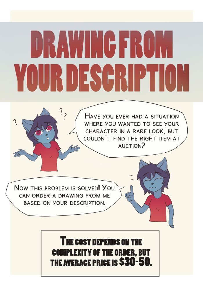 Hi) If you have an idea for a picture with a special plot, a new character, unusual clothing, an interesting style, or anything else, I'd be happy to help you bring it to life. I also draw NSFW, but I'm not prepared to draw very heavy scenes. 15$ SB 5$ MB 50$ AB 50 - Full color 60$ - Super drawing (be prepared to wait) +5wings + 0 Any clothes. +15 any background +10 futa +10 NSFW (If you have additional requests, then it can be easily discussed) - (Boosty) - Hipolink