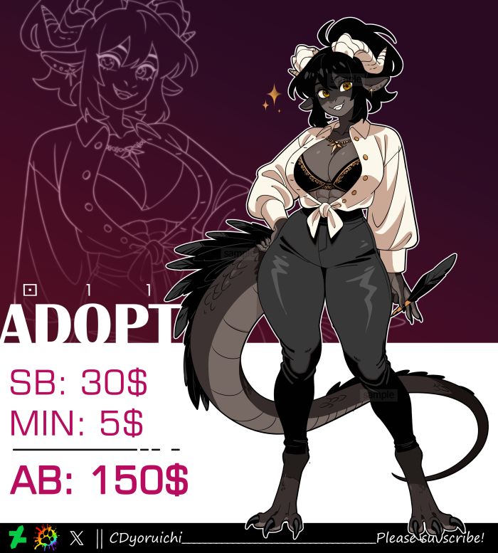 [Restarted auction] [SB]: $30 [MI]: $5 [AB]: $150 + commercial use Emergency email [email protected] (in case the CRM is down and you can't contact me) _______________ • Payment on LavaTop (PayPal | Card) !!!Stripe is unavailable!!! • Payment within 24 hours after the end of the auction • Payment plan for $100+ (down payment 50% other 50% within one week) • No refund(even if paid in payment plan) • If payment isn't made, your bid will be cancelled and the previous bidder becomes the winner • In case of non-payment by two or more bidders, the auction is restarted • After receiving payment, you will have access to the source files(PNG, 4k): with and without background /// When making edits, you also receive both versions of the file in a corrected form /// From $50 - color changes (1 edit) /// you can change the color of the adopt or details on it once /// From $80 - minor detail changes (1 edit) /// you can add or remove a detail from the adopt once /// $150 - commercial use approval + you can add the name and any text information to the adopt's reference sheet (example in the portfolio) https://www.deviantart.com/cdyoruichi https://www.furaffinity.net/user/cdyoruichi https://x.com/CDyoruichi https://bsky.app/profile/cdyoruichi.bsky.social