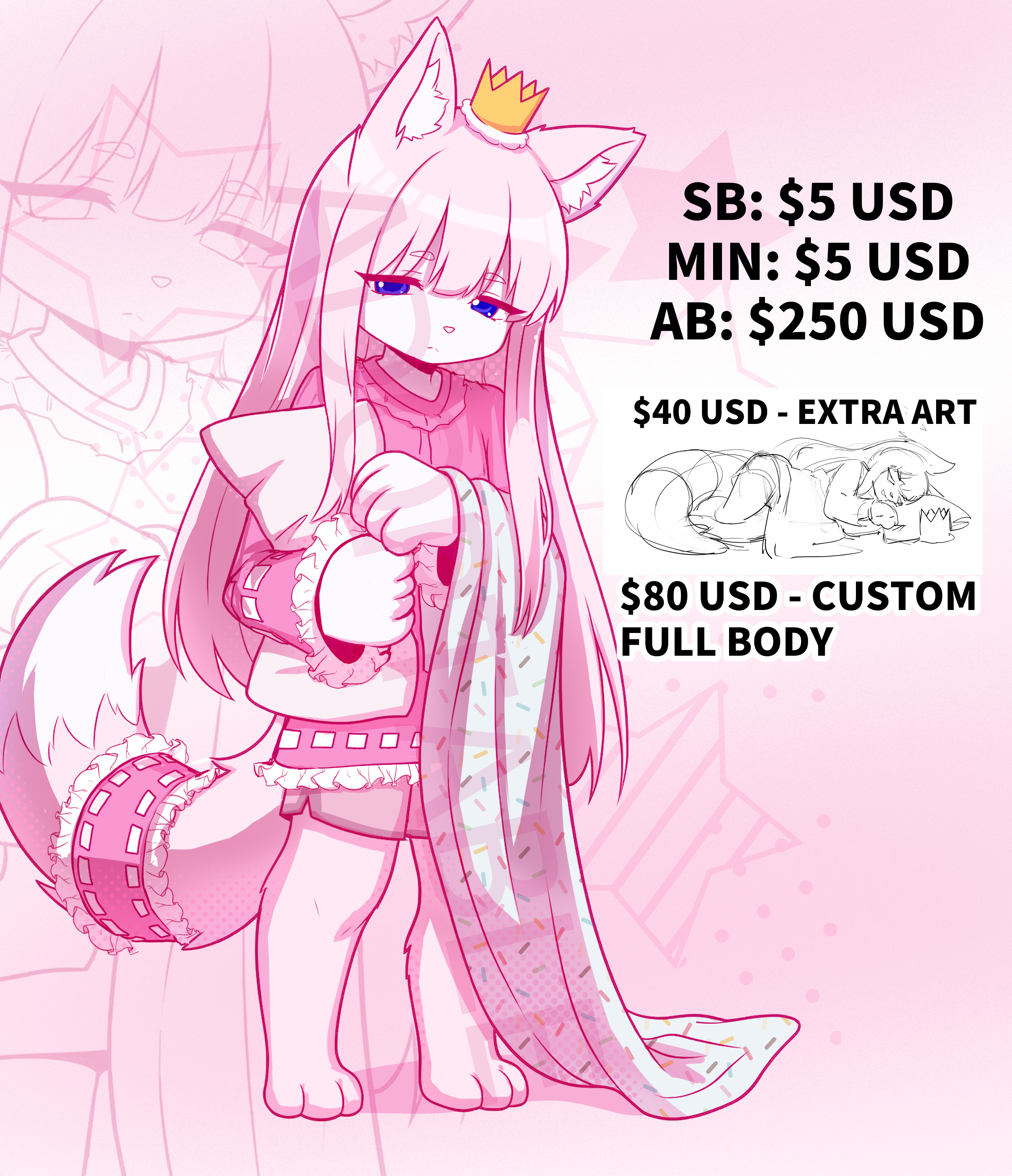 SB: $5 USD MIN: $5 USD AB: $250 USD You will receive: A transparent version of the character illustration, a version without watermarks and bonuses: At $40 Extra artwork (Finished, preview is only the sketch) At $80 A Custom Full body artwork All information in the general TOS applies to adopts. https://pandego.carrd.co/ **General information** - All adopts have a 20% discount in future commisions. - After the purchase you are allowed to request changes to design for a surcharge of 10% to 50%. - After the payment you will receive a full version without watermarks and bonuses included. **Payment information** - Payment must be made within 48hours of the auction ending. - Payments are done via PayPal or stripe. **Rights** After purchase you own the character and rights associated with it, and you are allowed to use it however you please. You give me the permission to use a watermarked version with credits to you as a portfolio and example piece for future clients.