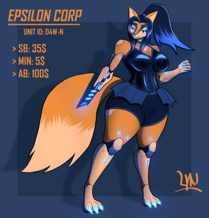 Epsilon Corp | Unit ID: D4W-N Starting bid: 35$ | Minimum Increment: 5$ | Autobuy: 100$ - | By acquiring this unit, you get: | - ☆ Full rights to utilize, modify, and resell this character! ☆ Original resolution PNG file (Or any other format of your choice), alongside backgroundless, lineart only, and flat colour images. ☆ Option to add written name of your choice ☆ 10% discount on any future comms from me featuring this character! - | Extra Bonuses | - ☆ $45+ Option to change the character's colour palette at will! ☆ $65+ Access to original .CLIP or .PSD file, with layers labelled and ready for editing! ☆ $85+ Option to add an accessory of your choice to the character, plus other minor design adjustments! ☆ $100 Get a free complimentary bust shot commission of the character! - | Terms, Conditions, and Misc. Info | - ☆ Legitimate offers only, please! Only bid if you're ready to buy. ☆ Payment is done exclusively via PAYPAL or Ko-Fi ☆ This adopt will be posted across multiple platforms. ☆ Contact me, and find my work on: * DISCORD (BEST OPTION FOR CONTACT): lyn_griffin * BLUESKY: https://bsky.app/profile/lyngriff.bsky.social * FURAFFINITY: https://www.furaffinity.net/user/sound-d3mon * DEVIANTART: https://www.deviantart.com/ - | Thank you!!! | -