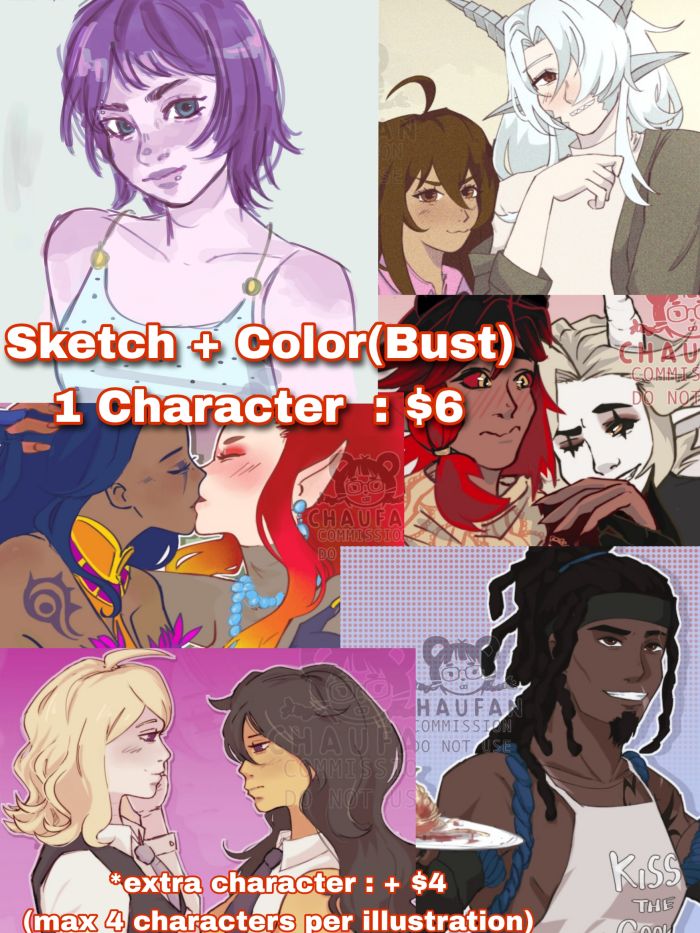 MI: $1 SB: $6 sketch + color ( some shading) ( 1 character ) extra character : +$4 (max 4 characters per illustration) Examples : https://portfolio.commishes.com/upload/show/1RSRQ/ https://portfolio.commishes.com/upload/show/1RNM5/ https://portfolio.commishes.com/upload/show/1R60D/ https://portfolio.commishes.com/upload/show/1RODE/ *Any gender and race * *Any clothes, accesories* --------------------------------------------- No refunds! ------------------------------------- To proceed with the illustration, I will need photo references of your character! If no photos are available , a detailed written description would also be acceptable :3 ------------------------------------- Deadline: 5-20 days ------------------------------------- My reputation ! https://loot.commishes.com/user/profile/CHAUFAN/ ------------------------------------- Only 3 revisions I'll start the full illustration once payment is done. ------------------------------------- You can contact me on: - discord chinchiraaaa - x.com/chaufan___ - Instragram: @chaufan_ my commissions are always open ❣️ I can communicate in both English and Spanish!