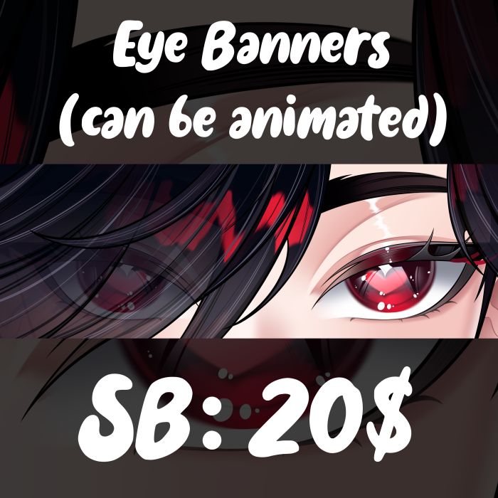 20$ - eye banner art in 4k quality without animation Examples - https://portfolio.commishes.com/upload/show/1OV7C/ https://portfolio.commishes.com/upload/show/1M72U/ https://portfolio.commishes.com/upload/show/1M9M7/ >30$ - eye banner art in 4k quality, animated blinking with physics Examples - https://portfolio.commishes.com/upload/show/1M9MA/ >40$ - eye banner in 4k quality, animated blinking, physics, angles xy, brows, hair movement with physics I accept payment via boosty or hipolink (with card). After the end of the auction, I will send you instructions if you have not paid in this way before. It's very simple, don't worry ♡( ◡‿◡ ) - Auction ends in 24 hours after the highest bid - I will start working after full prepayment - Deadline: 3 weeks - No refunds - Not retract after offering. Be sure you have the payment - Deadline Payment for 36 hours, otherwise the offer will be irrelevant and will open the auction again.