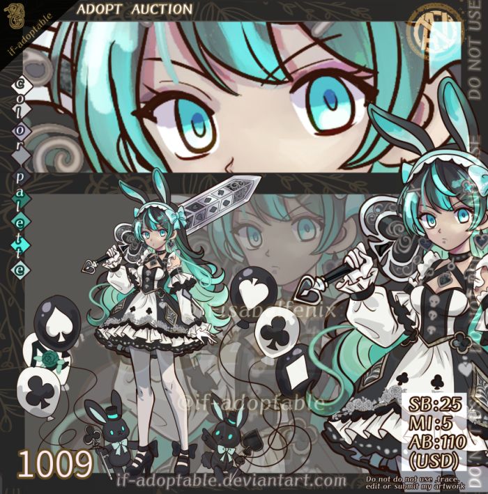 https://www.deviantart.com/if-adoptable/art/adopt-auction-1009-open-1315862059 🃏⚔️🐇Bunny Royal Diamond💎✨🃏 An eternal gambler who risks souls with every move. Don't trust her: she always has an ace (and a sword) up her sleeve. They say her edge can cut souls... Do you dare play with her? ************************************************************* sb:$25 mi: $5 ab: $110 (extra half-body drawing + commercial use ) auction ends 24 hours after first bid ,Payment on Paypal USD Rules: only serious offers ( no holds) Maximum 72 hours to make the payment or the offer will be considered cancelled. * Payment on Paypal USD *giveme credit for original design * You are free to redesign/ modify details * can resell for same price / trade or gift is fine /no refunds Only the owner is allowed to use it .not use without permission ********************* The lore is only a suggestion; its new owner decides its story.