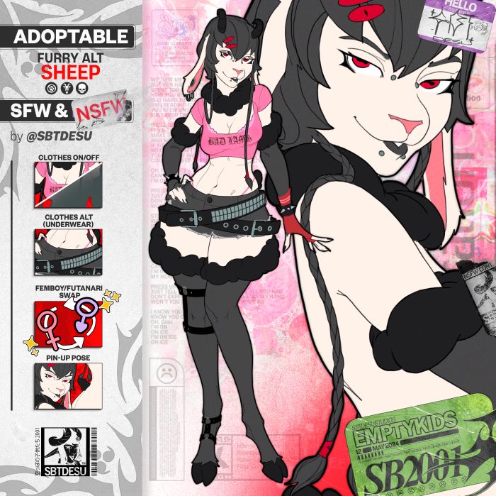ADOPT β’ Sheep Alt Girl Donβt let the fluff fool you πππ€ Starting Bid: $120 SB $120 β Base Design + Full Rights $160 β Alt Version (Clothes On/Off) $200 β PinUp Pose $250 β Fetish Addon (Futa or Femboy) $300 β Rendered Complete (Stand + PinUp) $400 β Fully Custom Commission β¨ NEW β¨ (AB) $550 β Spine2D Animated (Idle + Blink + Movements) β Note: Only one version (original or alt-swap) will receive the full render or animation. The buyer can choose which one. β’ Once adopted, you can do whatever you want with the character. β’ The full version will be sent after payment is confirmed. β’ Payment via PayPal (USD), within 24 hours. Feel free to check out my social media: Λ Twitter X: https://x.com/sbtdesu Λ Bluesky: https://bsky.app/profile/sbtdesu.bsky.social Λ Fur Affinity: https://www.furaffinity.net/user/sbtdesu If youβd like, I can also make a shout-out post to boost your adoption!