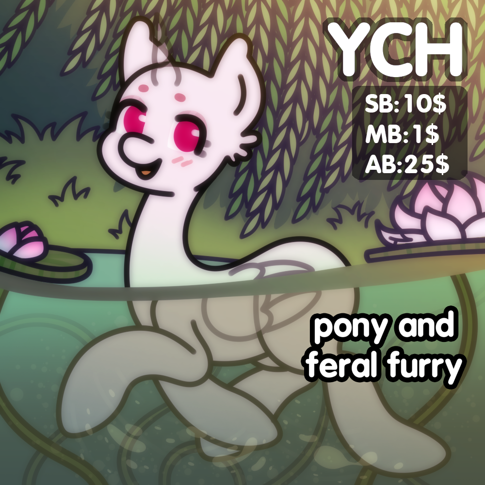 Simple Pony Cozy lake YCH 🎠 SB: 10$ 🎠 MB: 1$ 🎠 AB: 25$ AutoBuy: ● you can change emotion (only SFW) ● you can add any SFW text to the drawing ● you can change colors of water lilies ● you can change time of day ● you DON'T NEED to pay +10$ for difficult character Loot: https://loot.commishes.com/user/profile/nikuri/ ✿ *+:。.。 (๑ᵔс ᵔ๑) 。.。:+* ✿ 🦄 ALL races of pony and feral furry are accepted 🦄 Deadline is 2 weeks 🦄 Payment ONLY via Boosty (by CARD) in 48 hours. Prepayment 100% 🦄 NO refunds 🦄 When the auction ends, I send you message with general info for payment and after that before payment you need to send me your characters references for the drawing (and only after my respond you send the funds) 🦄 If the auction winner does not respond within 24 hours, then your place goes to the owner of the previous bid 🦄 Simple edits free, but each subsequent difficult edit +5$ 🦄 You need to pay +10$ for difficult character 💜 Custom commissions are open 💜 Connection with me: 🐴 Telegram: (nikurya) http://t.me/nikurya 🐴 Discord: (nikurya) https://discordapp.com/users/804642042520797190 🐴 CRM: https://crm.commishes.com/commission/nikuri/ ✿ *+:。.。 (๑ᵔс ᵔ๑) 。.。:+* ✿ CROSSPOSTING IS PRESENT IN: 🍬 Boosty: https://boosty.to/nikuri/about 🍬 DeviantArt: https://www.deviantart.com/nikuriii 🍬 FurAffinity: https://www.furaffinity.net/user/nikuri