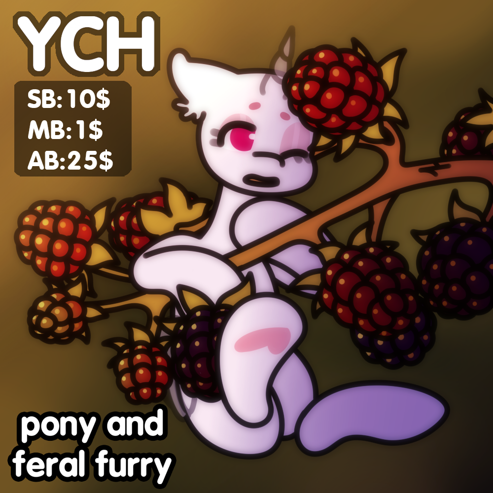Simple Pony Berry time YCH 🎠 SB: 10$ 🎠 MB: 1$ 🎠 AB: 25$ AutoBuy: ● you can change emotion (only SFW) ● you can add any SFW text to the drawing ● you can change color palette of berries ● you DON'T NEED to pay +10$ for difficult character Loot: https://loot.commishes.com/user/profile/nikuri/ ✿ *+:。.。 (๑ᵔс ᵔ๑) 。.。:+* ✿ 🦄 ALL races of pony and feral furry are accepted 🦄 Deadline is 2 weeks 🦄 Payment ONLY via Boosty (by CARD) in 48 hours. Prepayment 100% 🦄 NO refunds 🦄 When the auction ends, I send you message with general info for payment and after that before payment you need to send me your characters references for the drawing (and only after my respond you send the funds) 🦄 If the auction winner does not respond within 24 hours, then your place goes to the owner of the previous bid 🦄 Simple edits free, but each subsequent difficult edit +5$ 🦄 You need to pay +10$ for difficult character 💜 Custom commissions are open 💜 Connection with me: 🐴 Telegram: (nikurya) http://t.me/nikurya 🐴 Discord: (nikurya) https://discordapp.com/users/804642042520797190 🐴 CRM: https://crm.commishes.com/commission/nikuri/ ✿ *+:。.。 (๑ᵔс ᵔ๑) 。.。:+* ✿ CROSSPOSTING IS PRESENT IN: 🍬 Boosty: https://boosty.to/nikuri/about 🍬 DeviantArt: https://www.deviantart.com/nikuriii 🍬 FurAffinity: https://www.furaffinity.net/user/nikuri