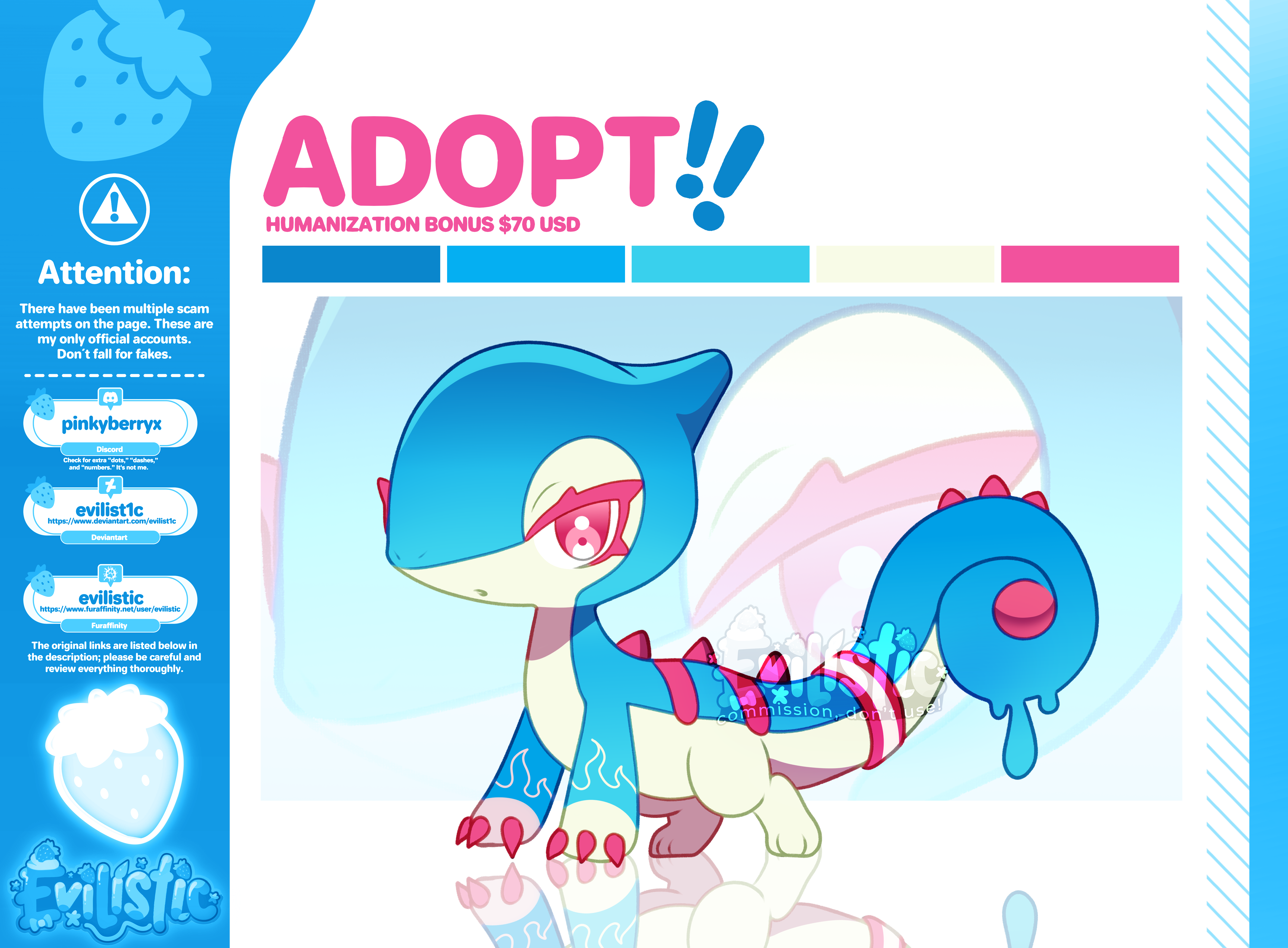 [Read the description] SB: $35 MI: $2 AB: $200 Only PayPal $35 USD: Adoptable in high quality $70 USD: Adoptable in high quality + Humanized version [or chibi] $100 USD: Special Combo Bundle! Get the Feral Illustration + Humanoid Version + Chibi Version Ko-fi: https://ko-fi.com/evilistic π¨ ATTENTION π¨ There have been recent scam attempts involving fake accounts pretending to be me. Please read carefully. Scam Tactic You Must Be Aware Of Scammers have been using a very specific strategy to trick clients: They place a bid or take the AB (Auto-Buy) over real clients. While the artist is trying to contact the supposed βwinnerβ (the scammer), the scammer rushes to message the real client claiming: That someone made a fake offer Asking if the client is still interested in the service This is NOT me. These tactics are meant to confuse and pressure you. I Will NEVER: Contact you through any platform other than my official accounts Ask you to send money to any PayPal email address Message you privately offering deals or asking for information What YOU Should Do Be cautious of any unexpected or suspicious messages. Always check: Account creation date Post history Real activity If you receive external contact, message me through my official YCH Commishes profile to confirm authenticity. If something feels off: doubt it. Your safety comes first. If you find any suspicious account pretending to be me, please inform me so I can report it. π¨Final Reminderπ¨ Scam methods can change at any moment. Stay alert and be cautious with any suspicious account or message. ββ§*ββββοΉ€*Extra Bonus:*οΉ₯ ββββ*β§β Modifications: Small edits to the original design or alternate versions (such as scars, outfit swaps, minor redesigns) [+ $10β20 USD depending on complexity] Accessories: Add items like jewelry, hats, glasses, weapons, or themed props to your character [+ $5β15 USD each] Shiny Version: A rare, alternate color palette of your character (like a special shiny form!) [+ $15 USD] Custom Icon: Perfect for social media, with a themed and expressive background [+ $25 USD] Expression [HeadShot]: +$15 USD Three pack of Expressions [HeadShot]: +$35 USD (Happy, sad, angry, surprised, kissing, winking, etc). β§β‘β§ββββ§β‘β§ββββ§β‘β§ Reviews: https://loot.commishes.com/user/profile/Evilistic/ β§β‘β§ββββ§β‘β§ββββ§β‘β§ Payment must be made within 24 hours after the auction ends!! After payment, you will get all rights to it without watermarks. Check your money wallet before bidding. Unwatermarked version will be sent after payment. It is allowed to sell, give away, or exchange between people. No refunds. Waiting list: https://trello.com/b/Z9Dvih7K/β¨-waiting-list-β¨ Furaffinity: https://www.furaffinity.net/user/evilistic Deviantart: https://www.deviantart.com/evilist1c DISCORD: pinkyberryx